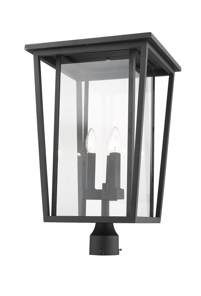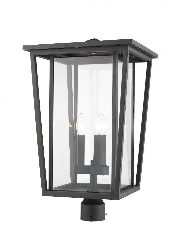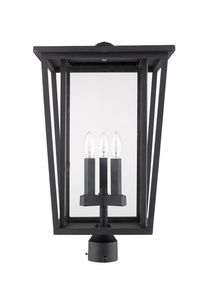 Linear styling pours on the sophistication in the design of this outdoor post lantern. Mount at the height of your choice, enjoying the sleek black finish and three-light candelabra bulb base that sits behind elegant clear glass.