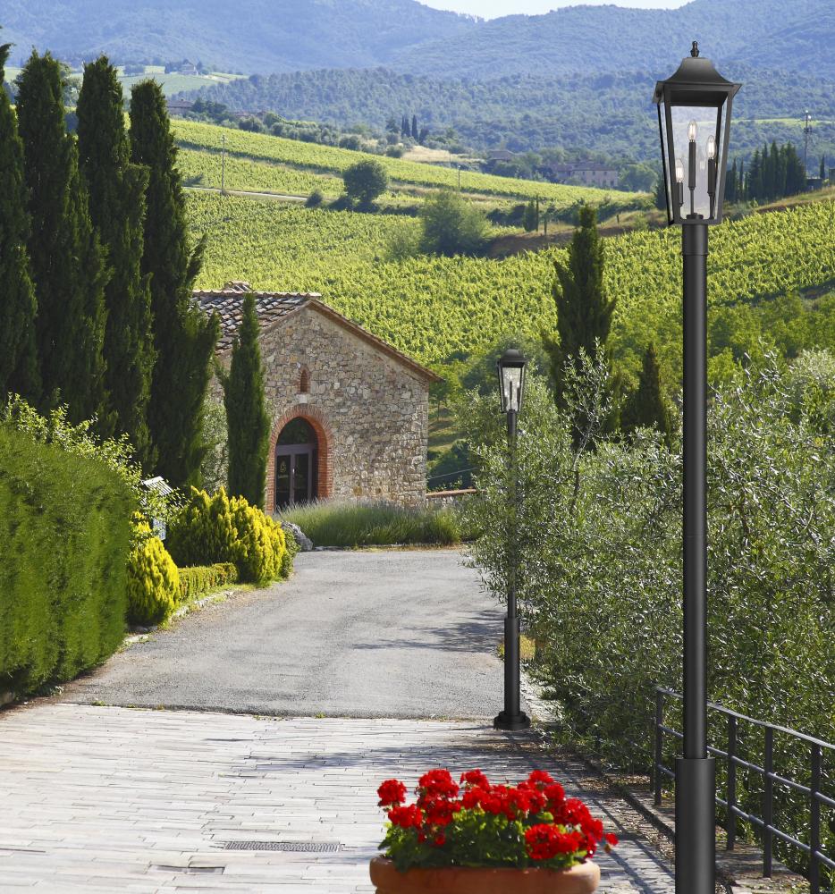 A charming post pairs with candelabra lights in a charming traditional three-light outdoor post mount fixture. Beautiful tucked into your garden or gracing a walkway, it features a durable Coastal black finish paired with beveled glass for a look thats truly timeless.
