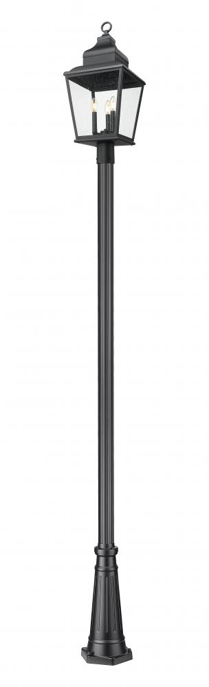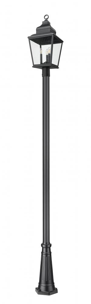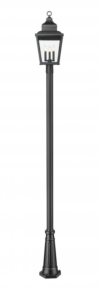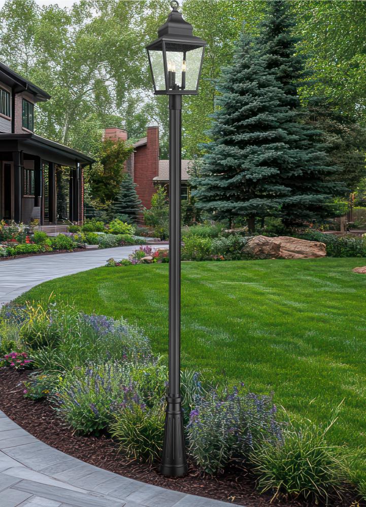 Timeless style creates a stately, romantic vibe in a three-light outdoor post mount fixture ready to complement front and back yard spaces. Sand black finish aluminum delivers a soft yet bold look with refinement, as rich detail brings a multi-tiered cap, contoured silhouetting, and clear seedy glass panels offering a peek-a-boo view of romantic candelabra style bulb mounts. Make this dimmable light a fashionable and functional light source with adjustable lighting levels.