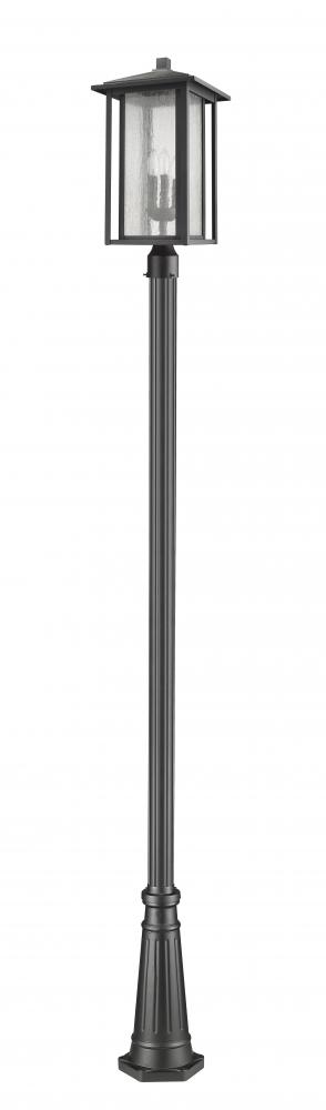Artistic styling adds a traditional feel to this black finish three-light outdoor post mounted fixture. Durable aluminium forms a sturdy body and a dual frame accentuating a seedy glass shade and a candelabra-style bulb base.