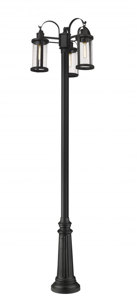 This three-light outdoor post mounted fixture can revitalize the look of your porch or patio space with its lantern-like appearance and classic yet modern character. Black aluminum composes the elegant post and caps the top and bottom of the two cylindrical shades, finished with clear seedy glass. LED bulbs effectively illuminate your space, making this a clear choice for sleek, energy-efficient exterior lighting.