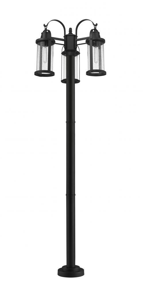 This three-light outdoor post mounted fixture can revitalize the look of your porch or patio space with its lantern-like features and classic yet modern character. Black aluminum composes the elegant, subtly flared post with its circular base, and caps the top and bottom of the two cylindrical shades, finished with clear seedy glass. LED bulbs effectively illuminate your space, making this a clear choice for sleek, energy-efficient exterior lighting.