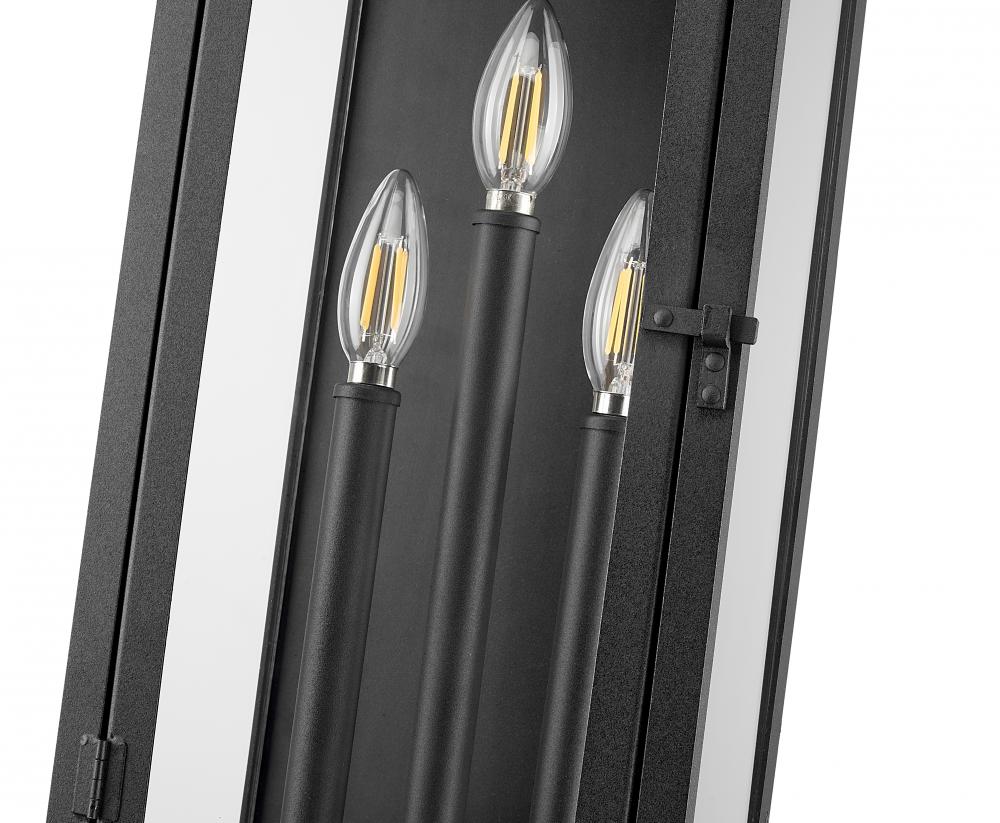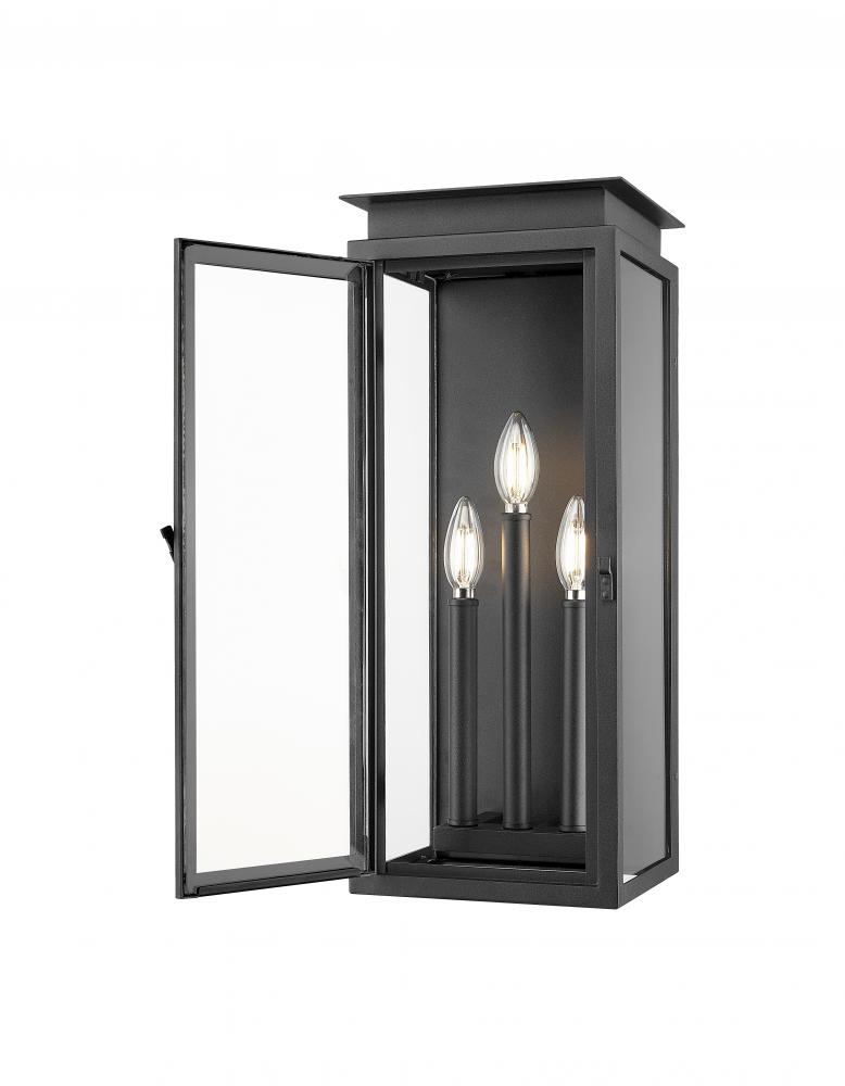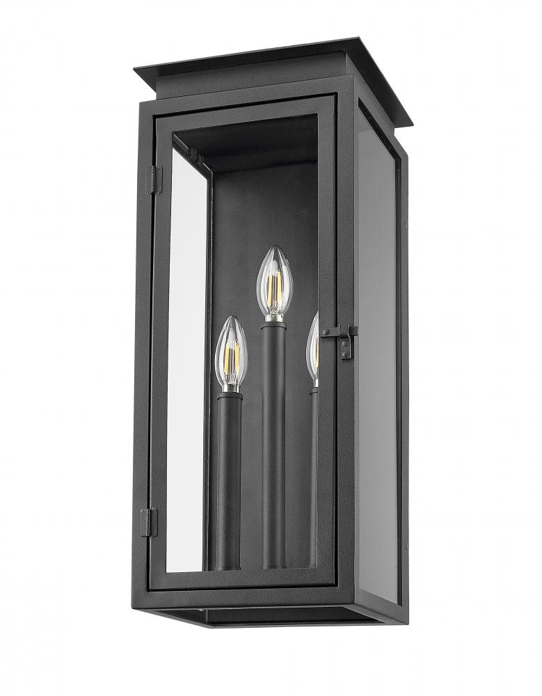 Offer stylish character to your exterior with this transitional three-light outdoor wall light. A lantern profile is paired with a layered cap and stepped trim, all on a coastal black finish that adds excellent durability. The lantern includes candelabra light within and glass panels for excellent illumination.