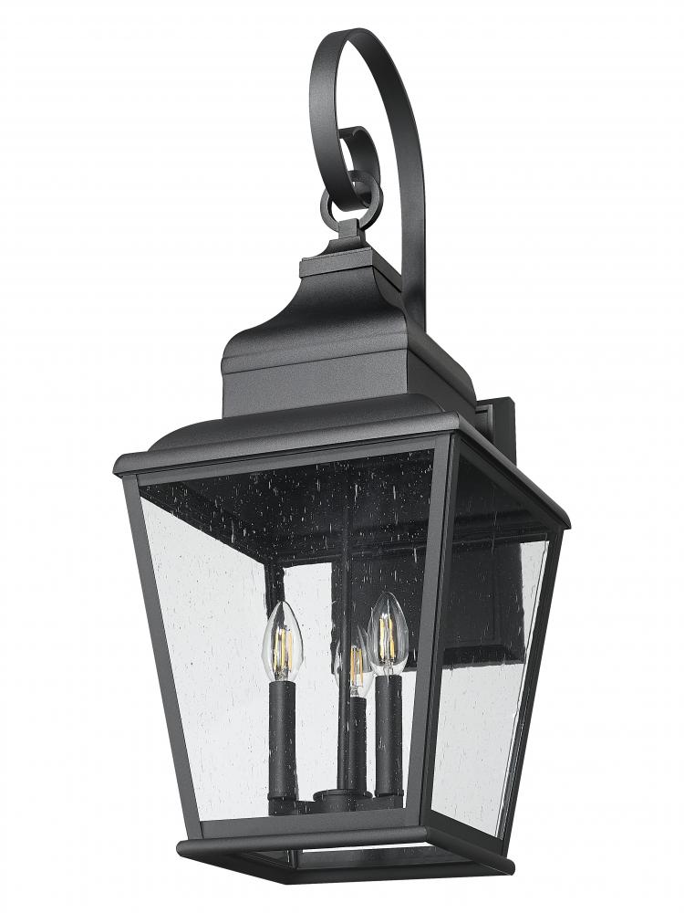 Embellished with ornate detail, this three-light outdoor light offers a classic look of decorative attitude, ideal for creating chic outdoor porches, decks, and outbuildings. Sand black finish aluminum construction delivers a lantern-like frame, tapered and dressed up with stylish detail, and clear seedy glass panels offering a mystical quality. Dimming features are especially useful in exterior settings, adjusting to time-of-day needs.