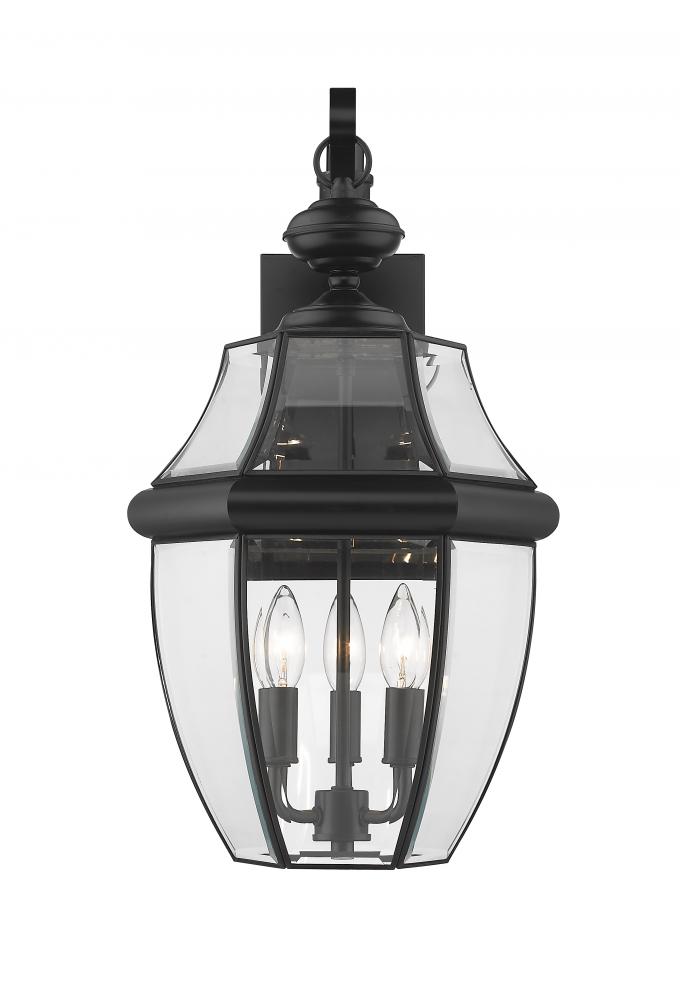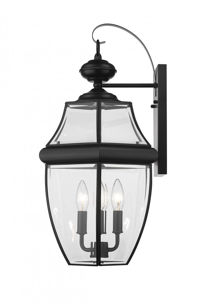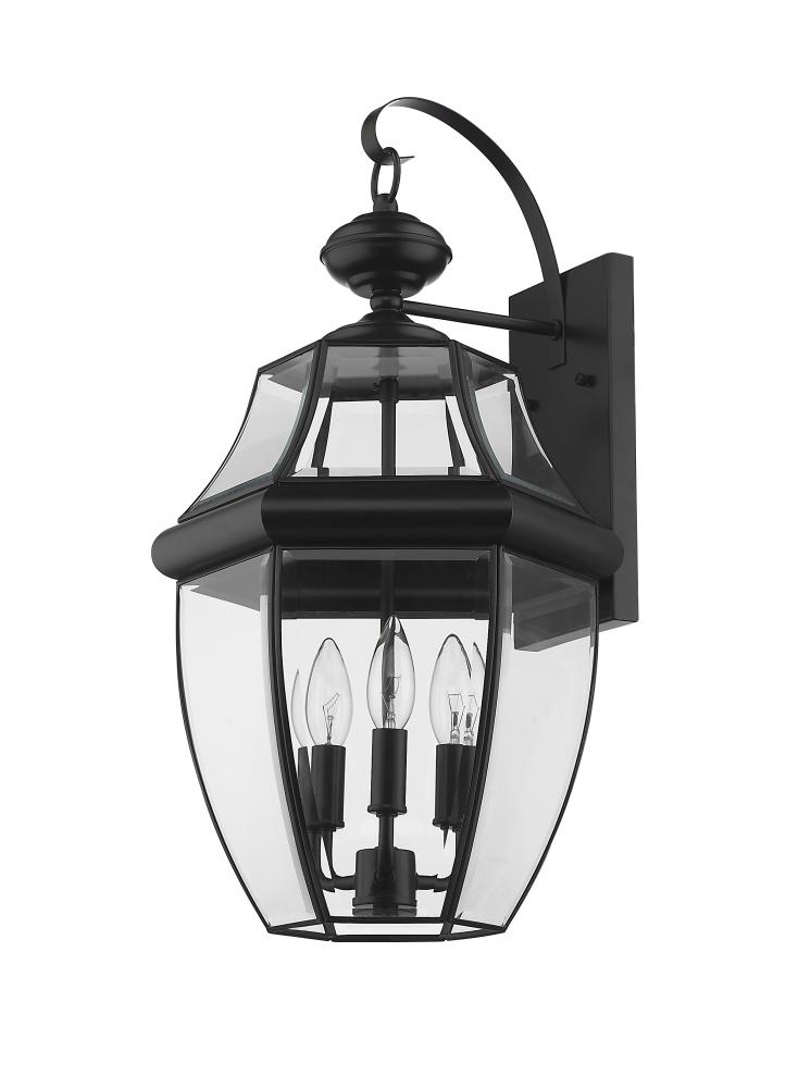 This three-light outdoor wall sconce adds a classic silhouette to the lighting in your patio, deck or porch area. With its candelabra composition, the sconce provides soft, effective illumination. A multi-sided clear beveled glass shade has a black steel frame, creating an elegant impression.