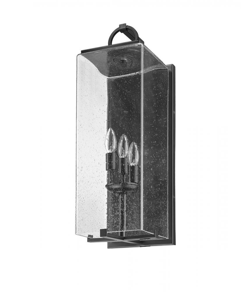 A lovely lantern-inspired silhouette leads to a three-light outdoor wall light thats suitable for contemporary or coastal exterior decor. Finished in black, this piece features candelabra style bulbs and a seedy glass shade for visual appeal.