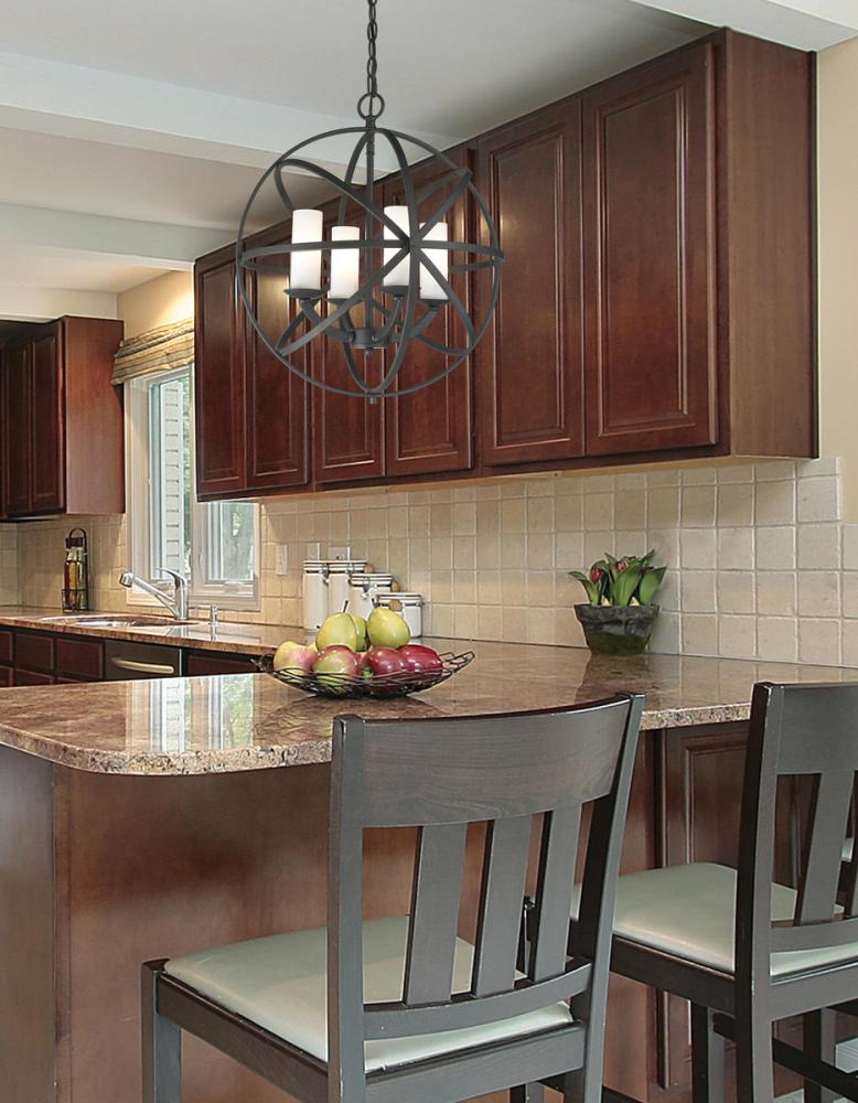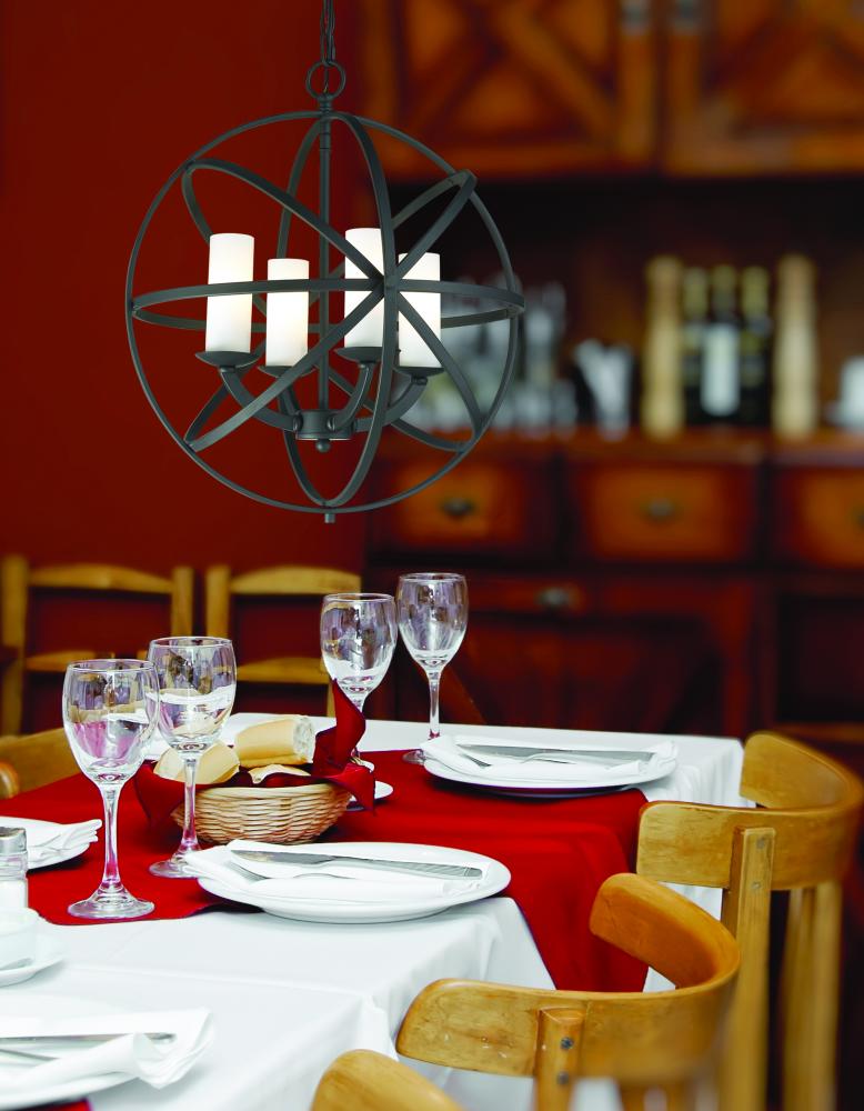 Orbiting metal bands circle the contemporary inner chandelier. This family is made up of round and oval shapes finished in Bronze finishes complimented with matte opal glass.