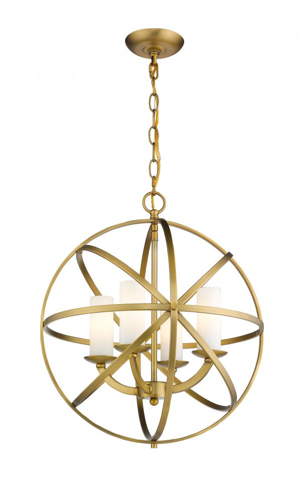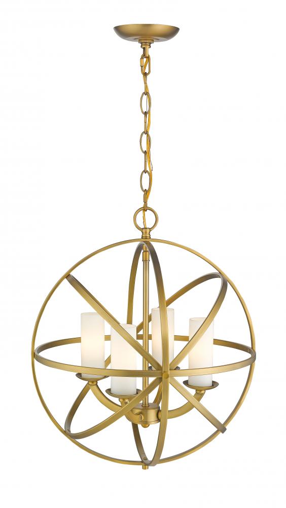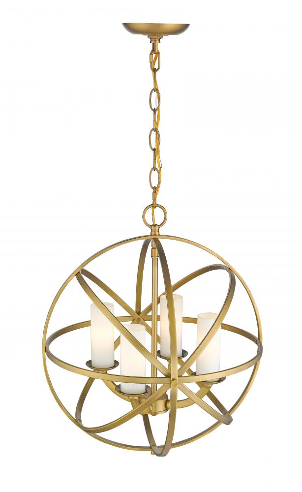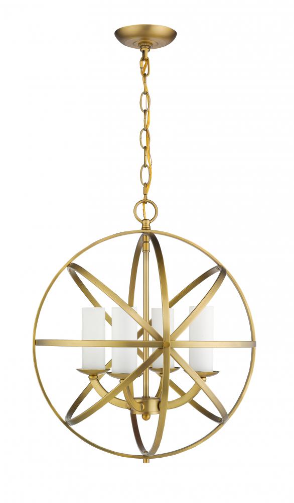 Orbiting metal bands circle the contemporary inner chandelier. The round and oval shapes are finished in Brushed Nickel, Bronze, Chrome and Heirloom Brass and complimented with Matte Opal glass (use of glass is optional)
