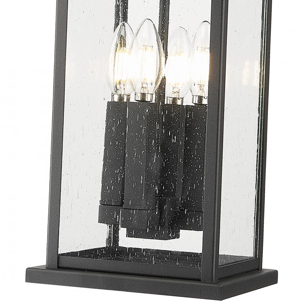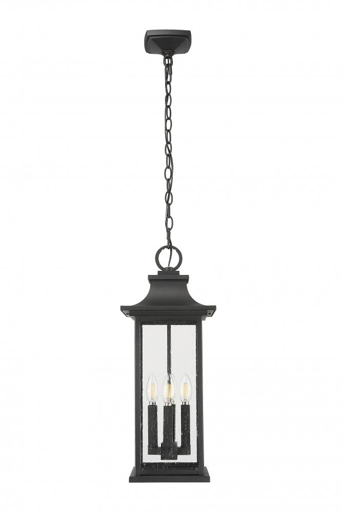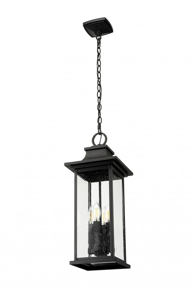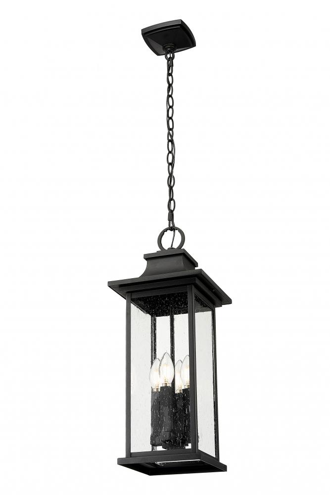 A flared cap and durable coastal black finish bring refined character to this transitional four-light outdoor pendant. Its lantern silhouette is clean and classic, with clear seedy glass panels that add a hint of texture and character. Its the perfect choice for a covered patio or porch.