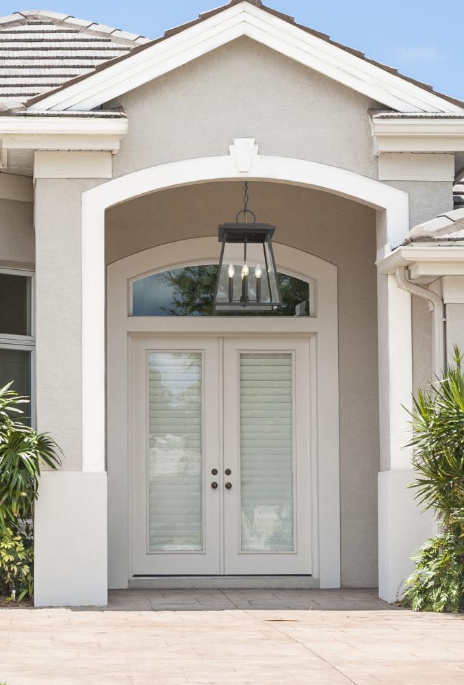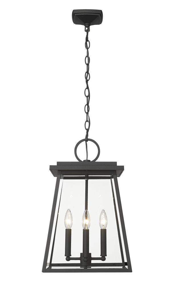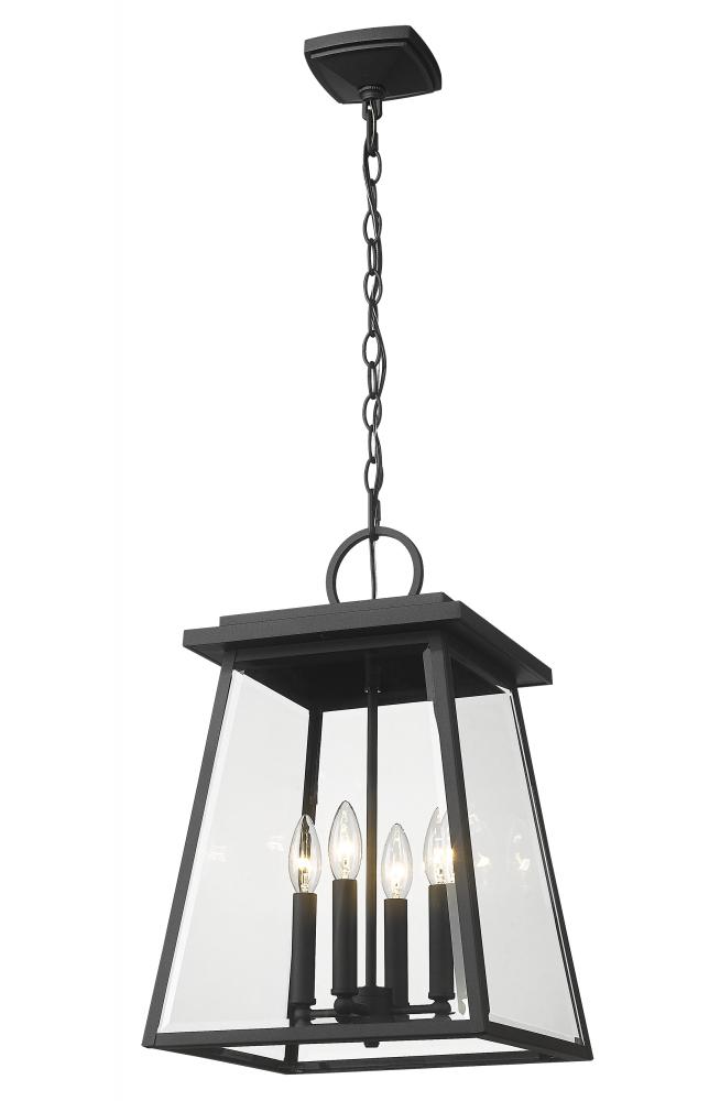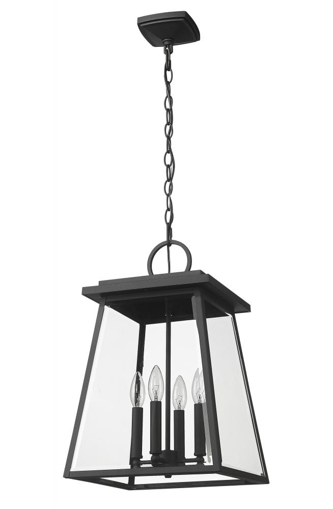 Soften a crisp modern vibe with the benefit of iconic village nautical styling in an exterior light. This four-light outdoor chain mount ceiling fixture creates a romantic feel with candelabra bulb mounts visible from an angled lantern-style black aluminum frame with clear beveled glass panels.