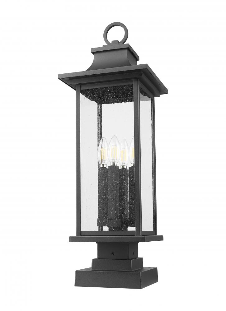 Capture the essence of curb appeal with the clean, precise silhouette of this transitional four-light outdoor pier mount light. Its lantern silhouette is timeless and inviting, complete with a flared cap and ring finial that adds decorative detail. Clear seedy glass panels assure bright, direct illumination from four candelabra lights tucked within.