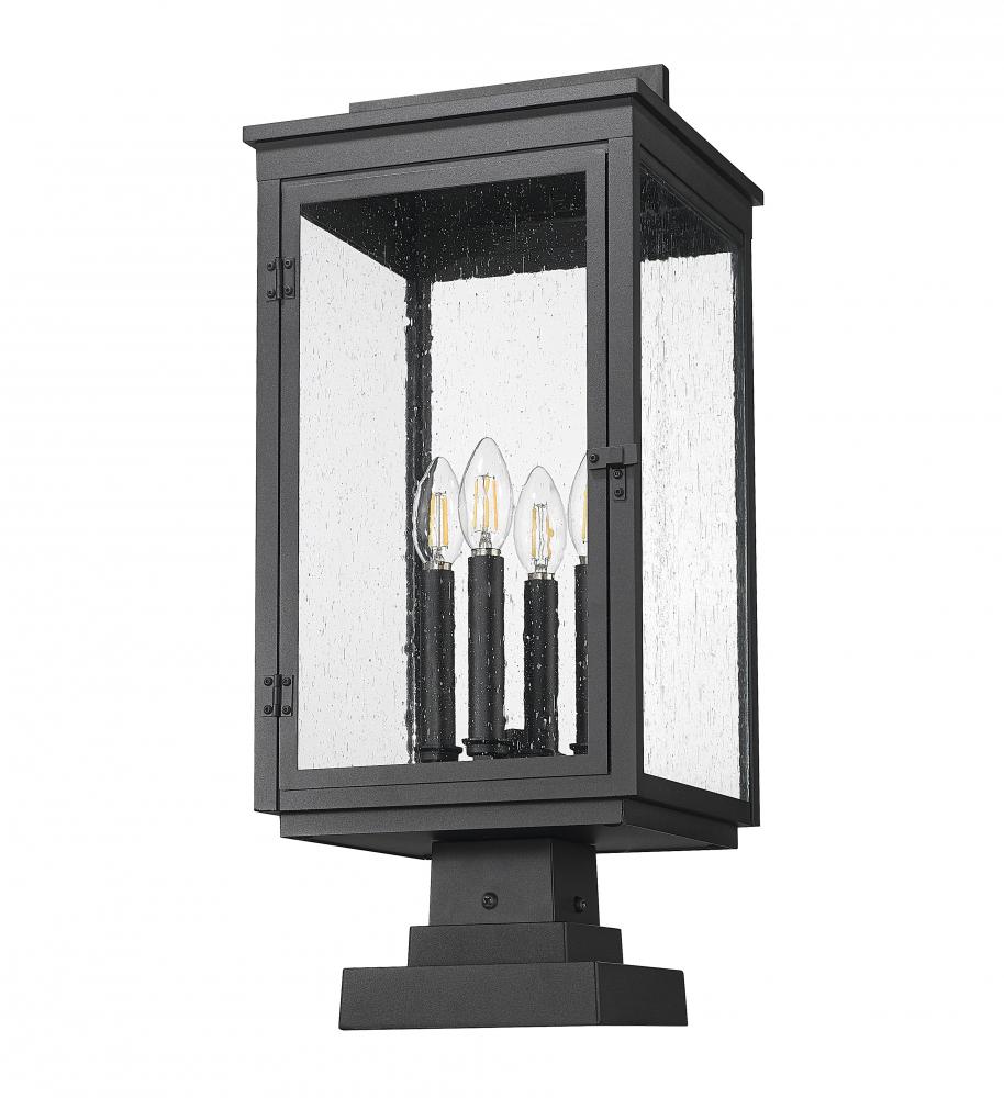 A charming handle detail pairs with clear seedy glass to bring charming flair to this traditional Mission four-light outdoor pier mount fixture. Perfect for curb appeal, it showcases subtle decorative details and candle-style lights that create inviting ambiance in your exterior spaces. A marine-grade sand black finish is a chic, timeless finishing touch.