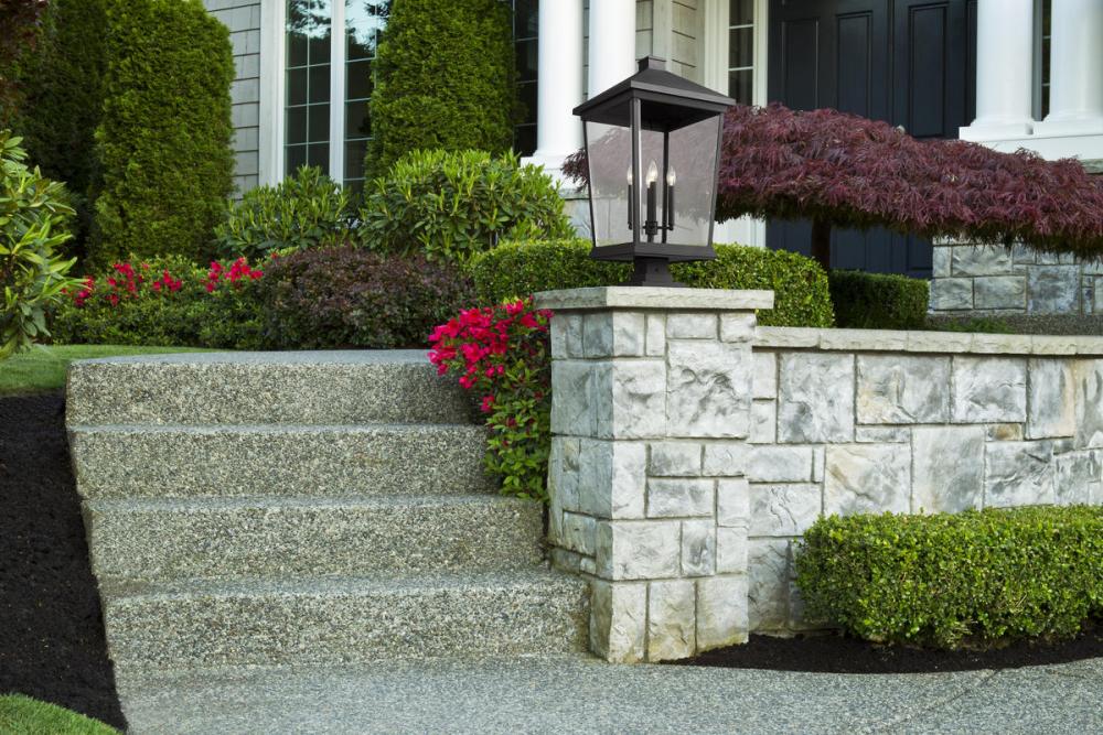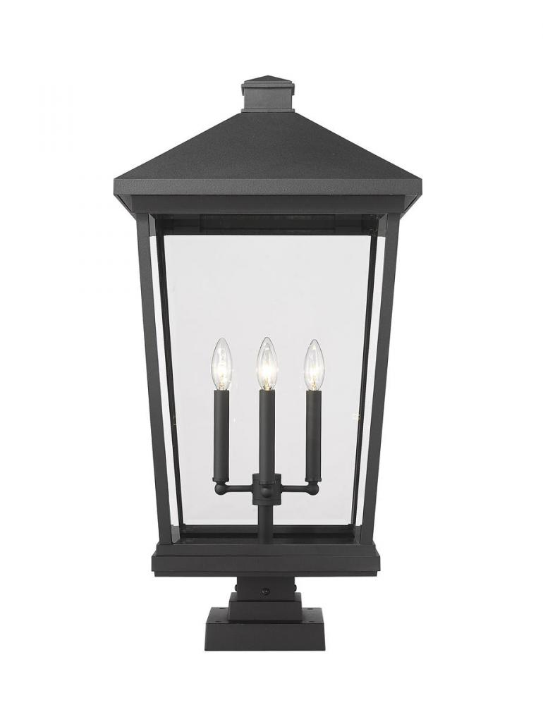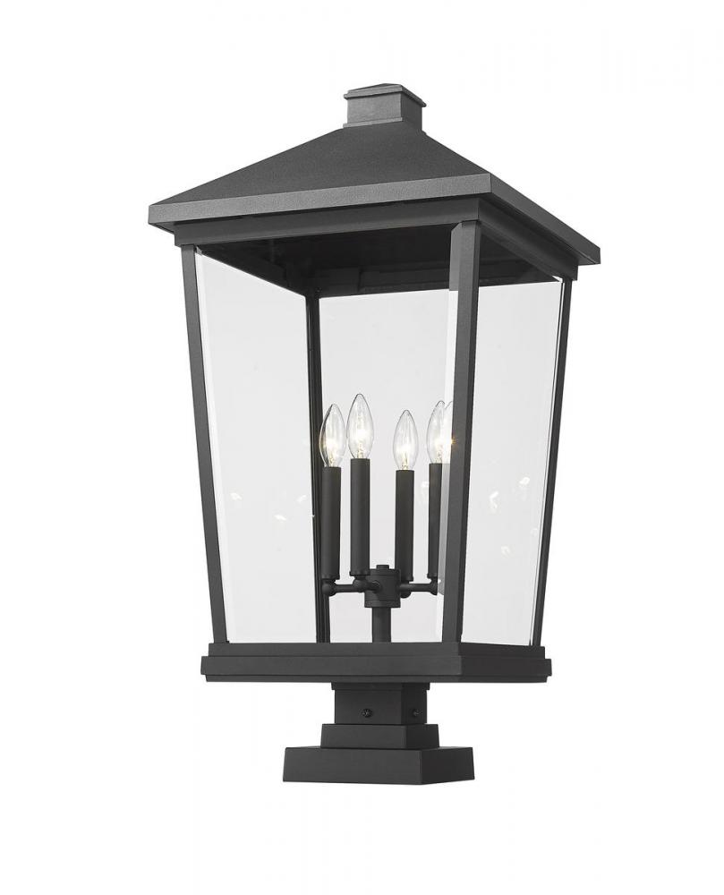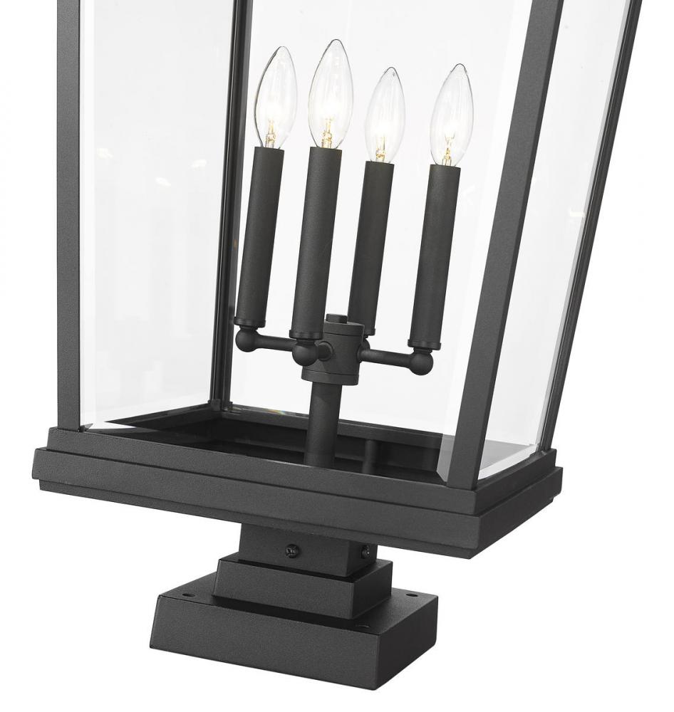 Matte black aluminum offers a sleek look that forms construction of this four-light outdoor pier-mounted fixture. This fixture from the Beacon collection puts a finishing design stamp on custom garden and walkway spaces, adding a hint of village-nautical charm. Clear beveled glass panels show through to candelabra-style bulb mounts, doubling down on traditional and transitional motifs.