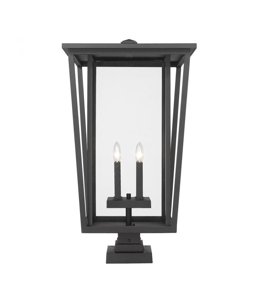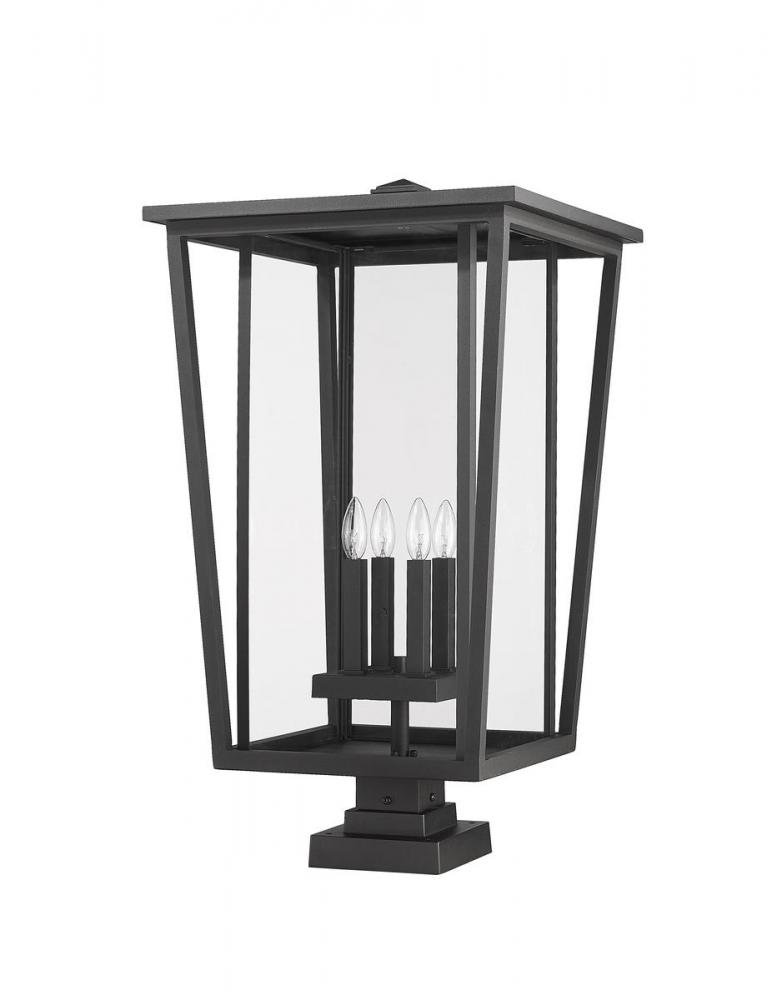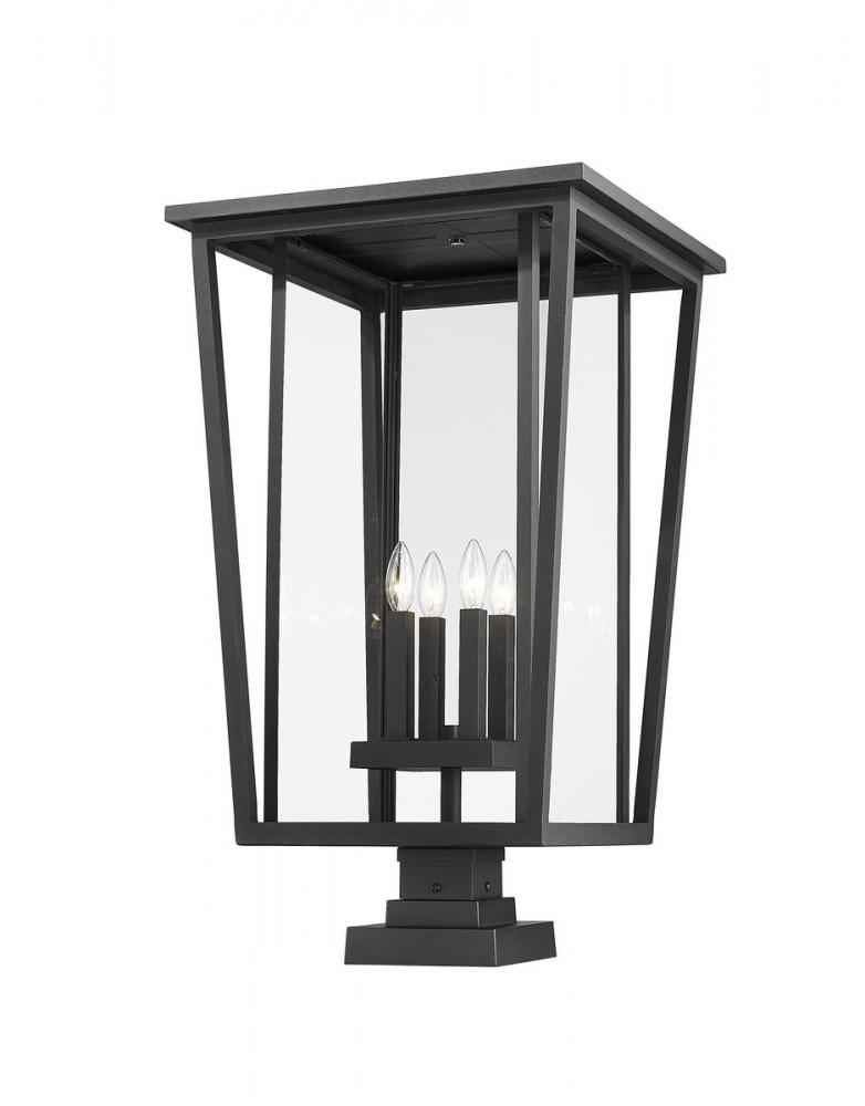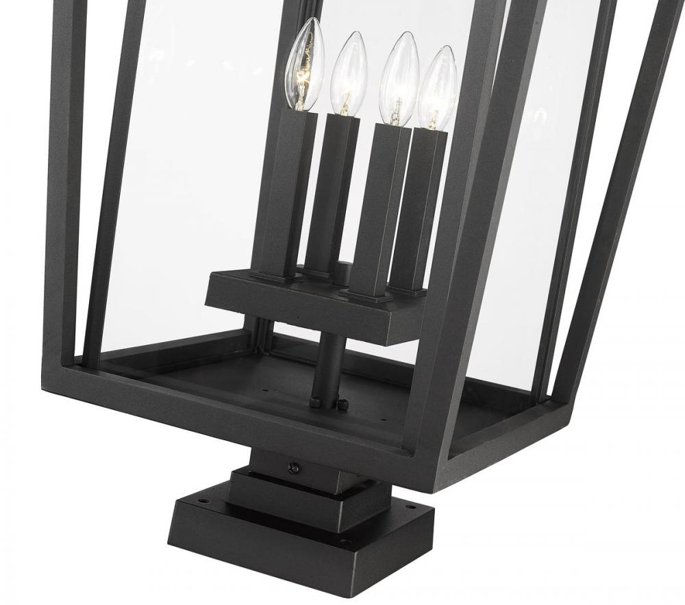 Ready to place in a custom garden or walkway space, this four-light outdoor pier-mounted fixture creates classic elegance with a mix of modern and traditional styles. This fixture from the Seoul collection offers a striking geometric design made of black finish aluminum and specially cut clear glass panels offering a view of a charming candelabra-style bulb base.