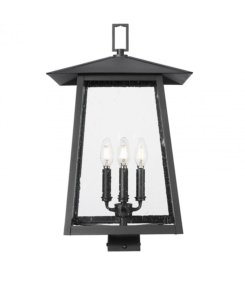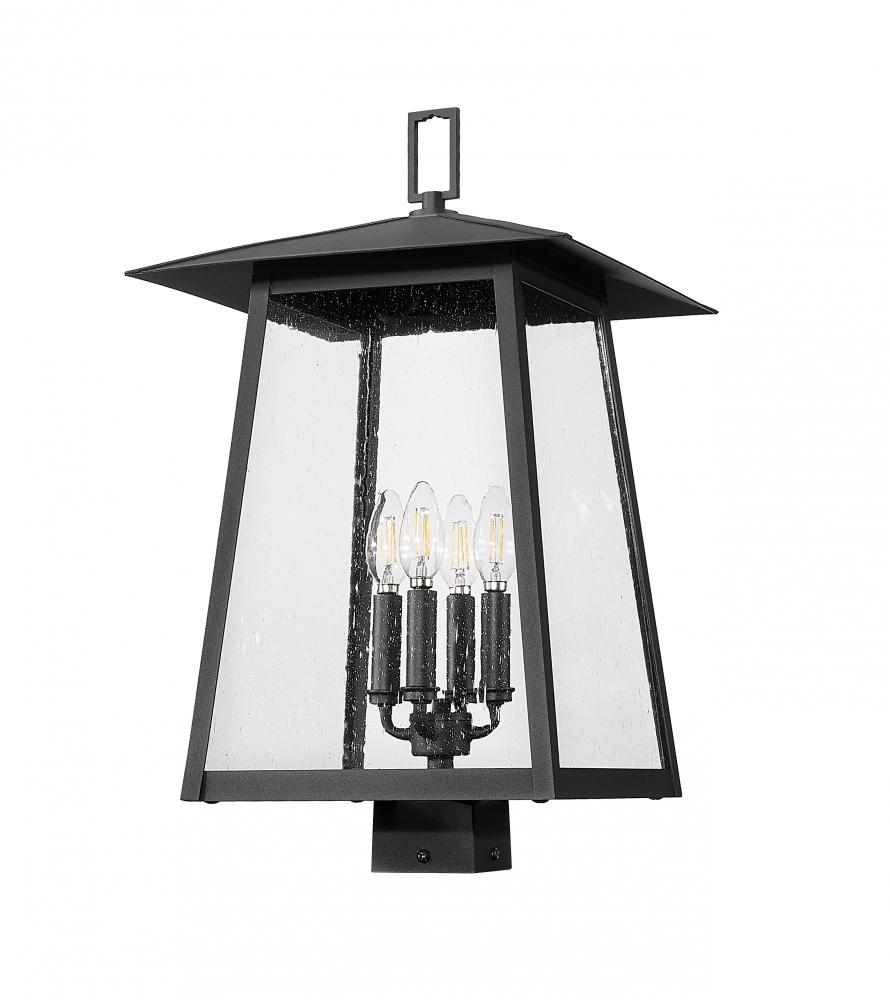 A classic lantern-inspired silhouette and design greets exterior gardens and walkways with ambient illumination as this modern four-light outdoor post mount fixture promises a sophisticated aesthetic. Top a post with this fixture featuring Coastal black painted aluminum with clear seedy glass panels, and a charming candelabra cluster base inside. This dimmable outdoor light tops the post of your choice and raises the level of elegance in a custom outdoor setting.