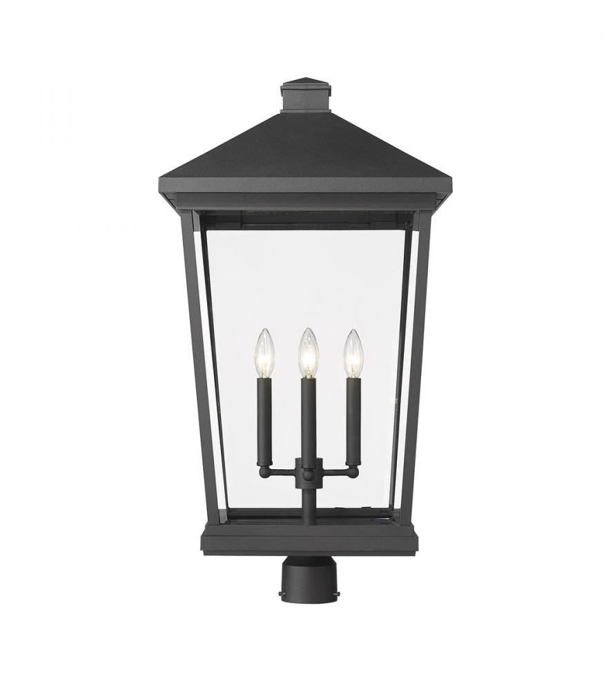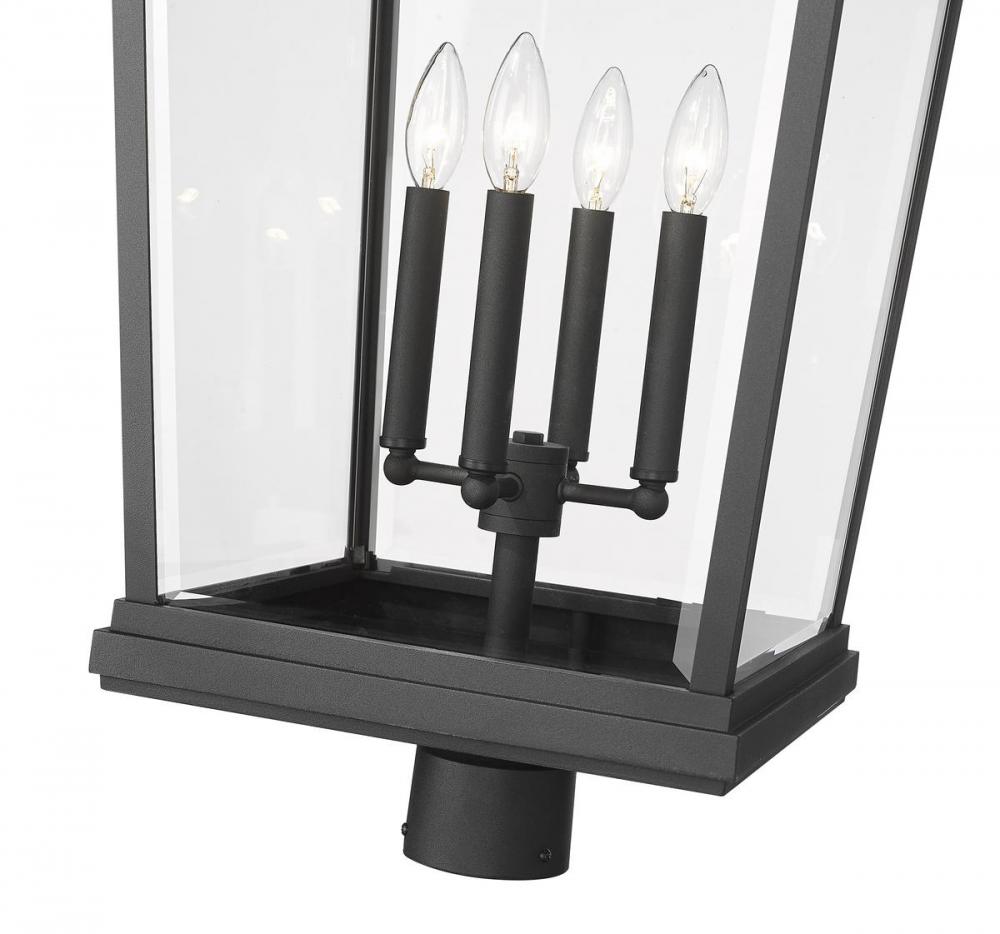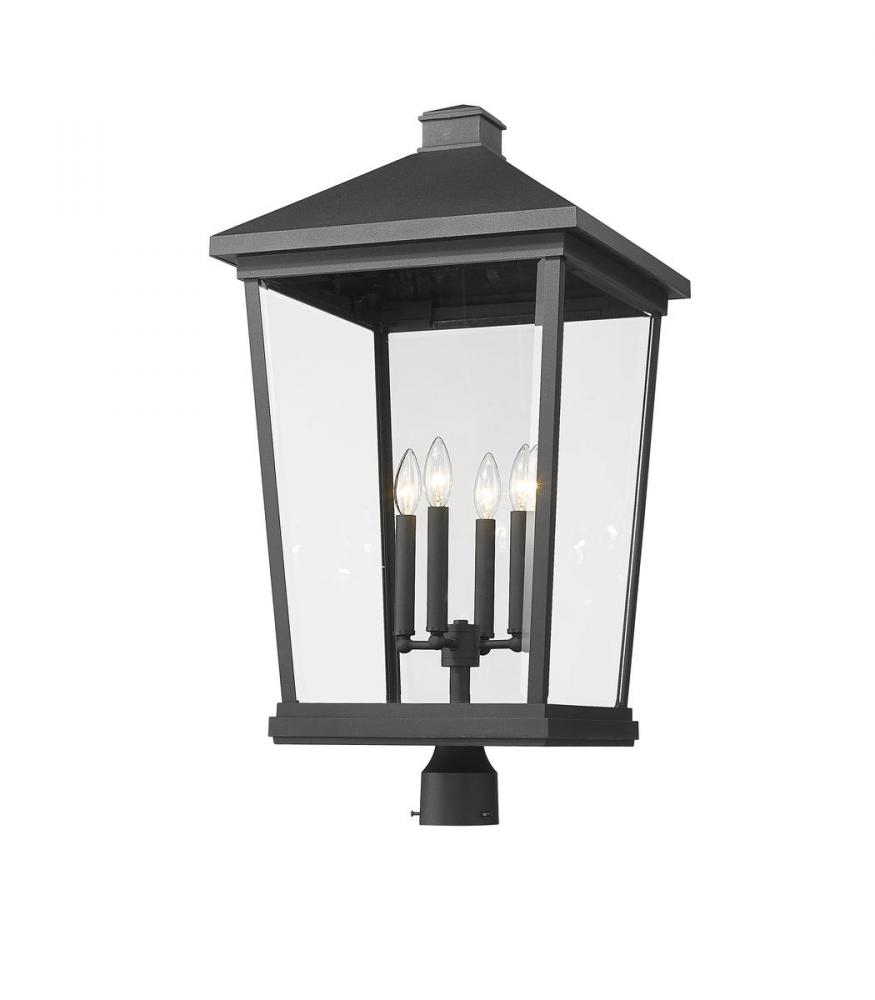 Soft, romantic village-inspired aesthetics lend a timeless look to this four-light outdoor post mount fixture. From the Beacon collection, this fixture features a house-like silhouette made of matte black finish aluminum with clear beveled glass panels. A charming candelabra-style bulb mount unit reinforces the nautical village flavor of this exceptional fixture.