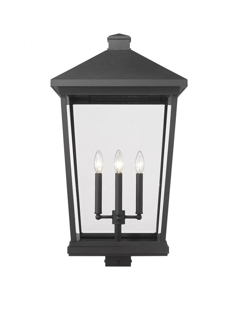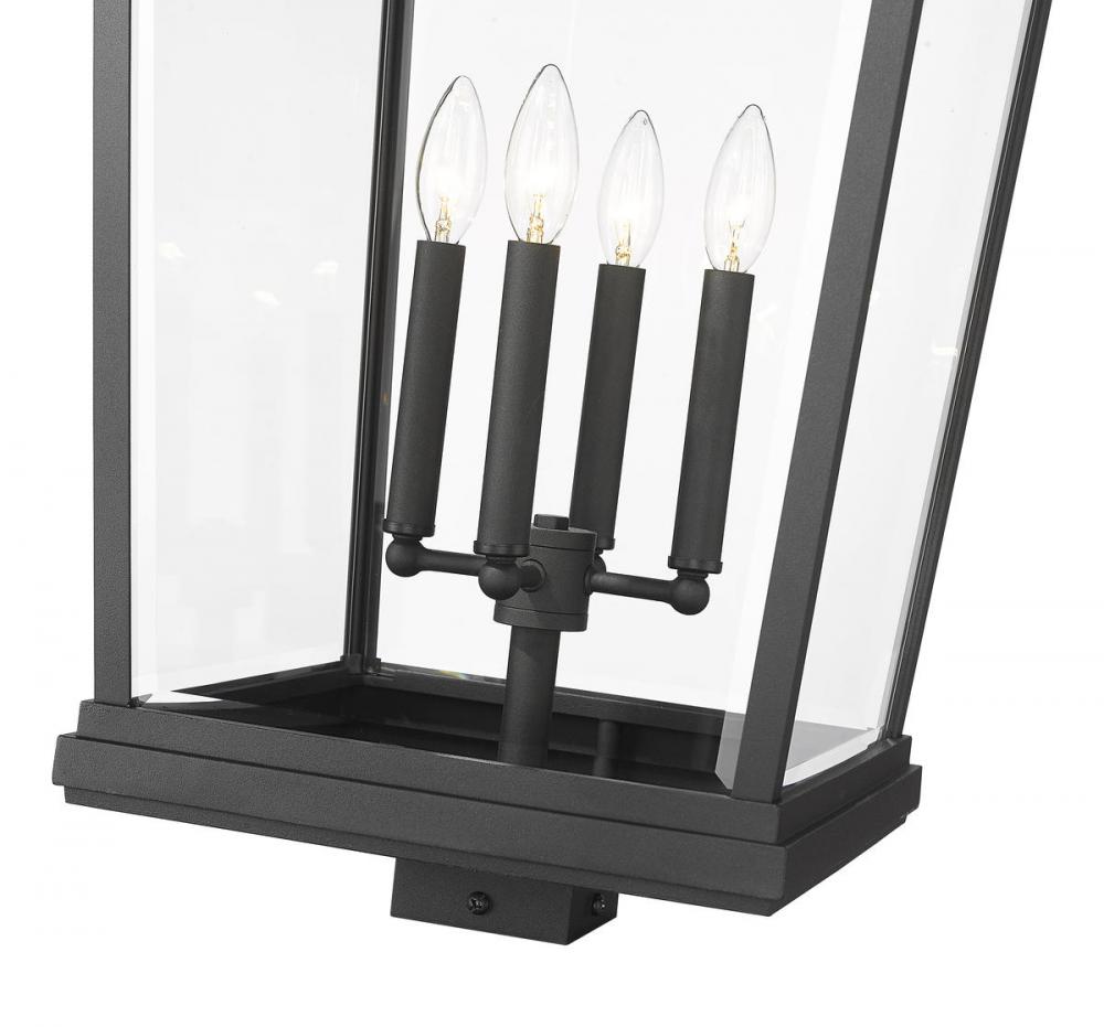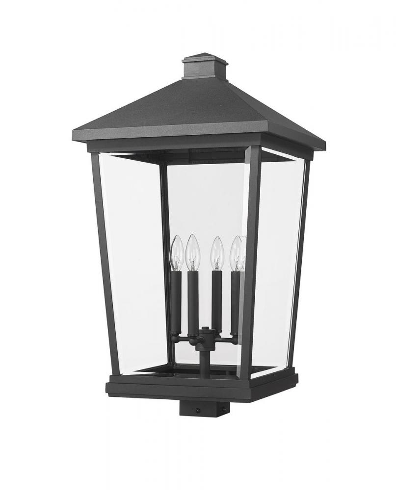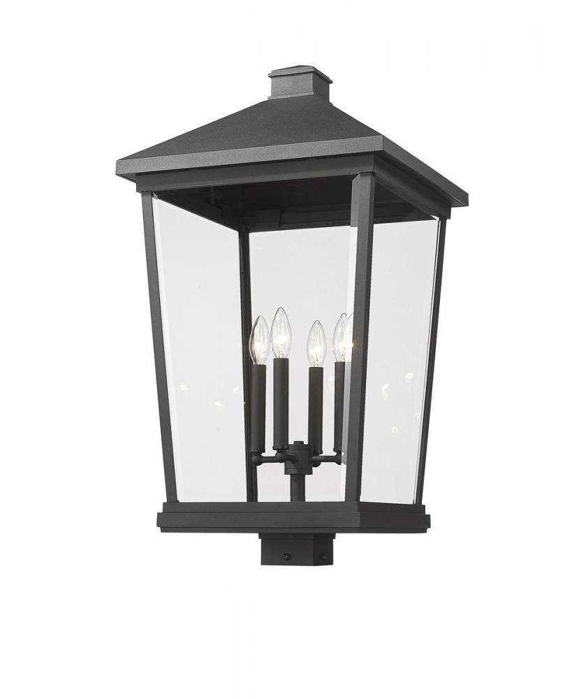 The Beacon collection offers this classic, stylish four-light outdoor post mount fixture to customize a sophisticated ensemble of patio, deck, or walkway spaces. Crafted of matte black finish aluminum, its house-like form features a traditional silhouette with clear beveled glass panels and a charming bulb mount unit thats ideal for romantic candelabra-style bulbs.