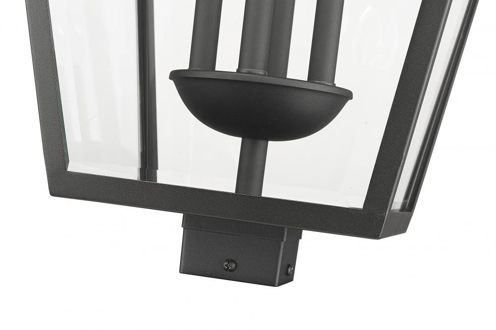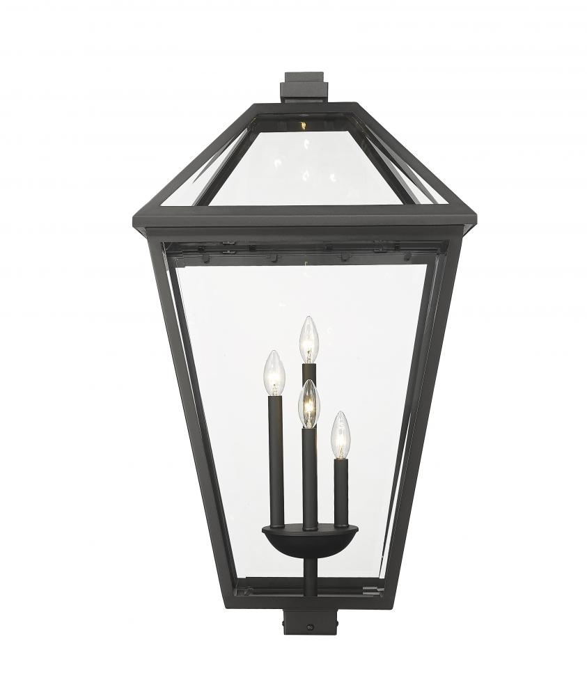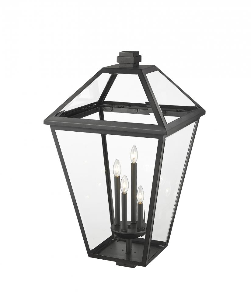 Indulgent with a village theme, this transitional light fixture creates definition with a black finish stainless steel frame and elegant panels of clear glass. The Talbot four-light outdoor post mount fixture offers a versatile style and mechanism that tops an existing post in an exterior pathway or walkway. An interior bulb mount cluster adds to the charming motif.
