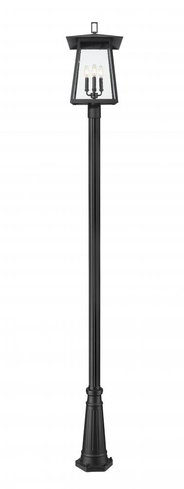 The iconic lantern design motif of this four-light outdoor post-mounted fixture embellishes any setting. A Coastal black finish aluminum frame and pole are pleasingly smooth, with clear seedy glass panels and a candelabra light mount delivering charming energy and timeless character. Use dimming features to create time-sensitive lighting.