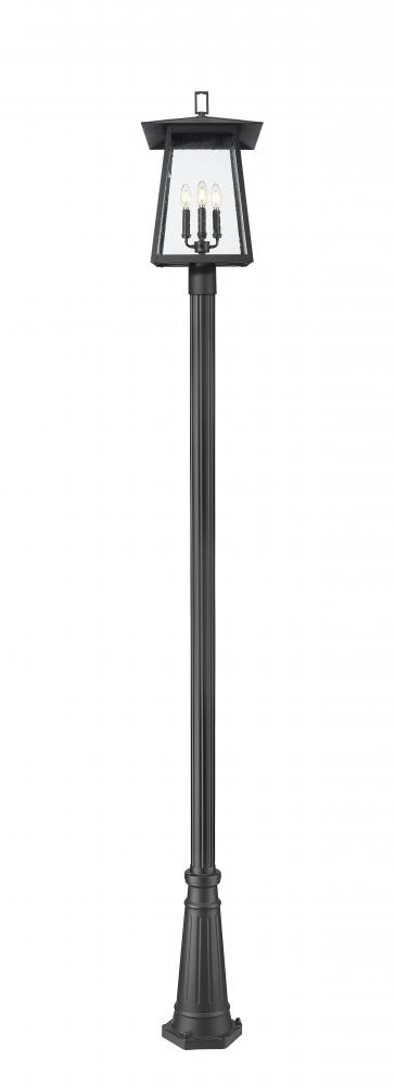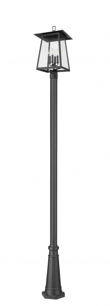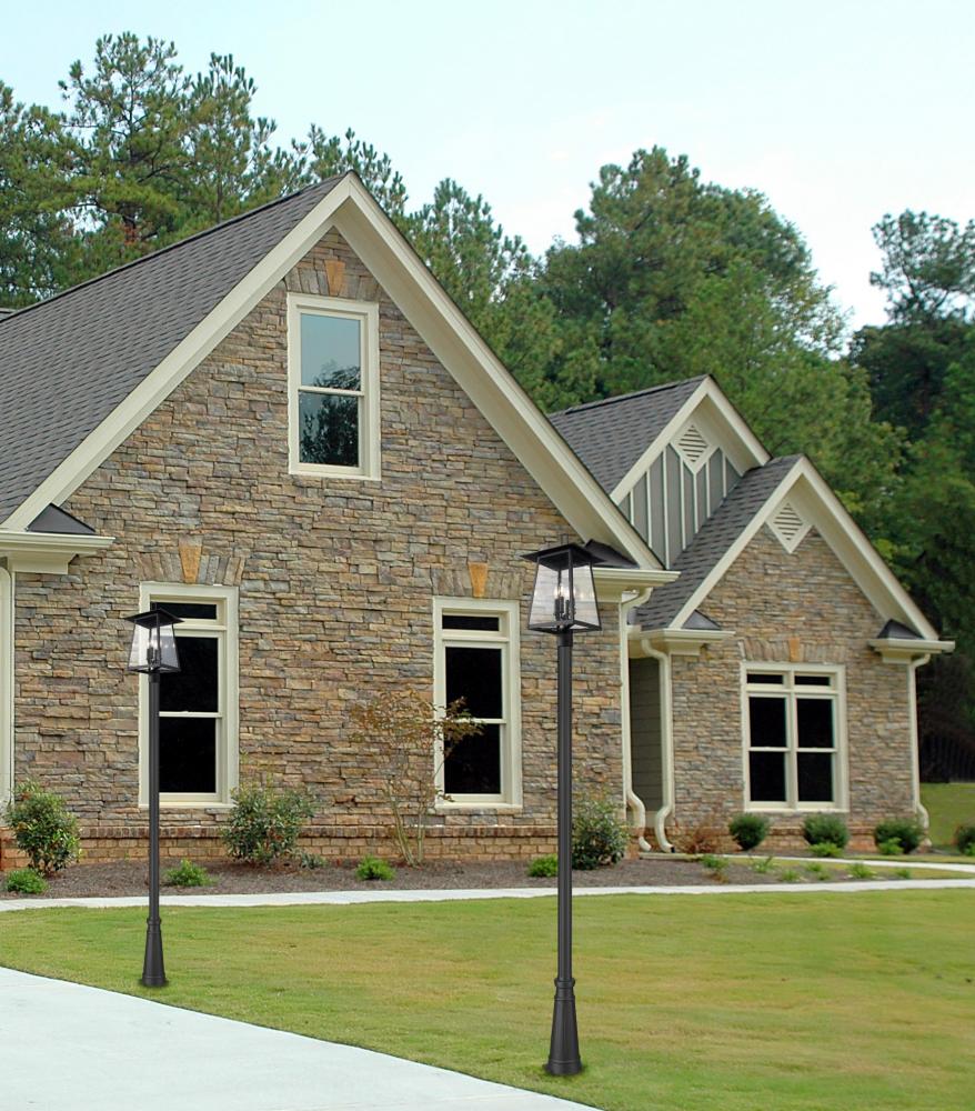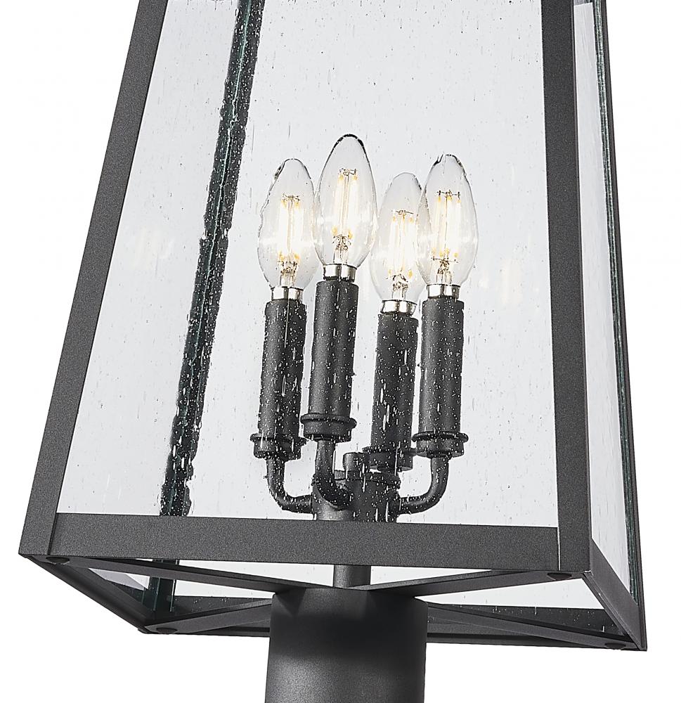 Plenty of ambient illumination glows from this four-light outdoor post-mounted fixture embellishes any setting. With a lantern motif and timeless design, it offers a sleek pole and frame made of black finish aluminum, smooth and pleasing, as clear seedy glass panels add a perfect dose of texture. Use dimming features to create just the right ambiance for every occasion and setting.