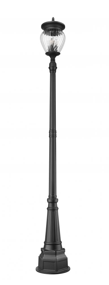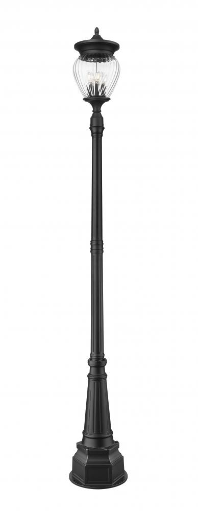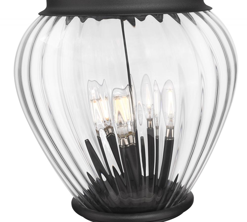 Village-inspired style takes on a hint of soothing influence in a glam four-light outdoor post-mounted fixture. Perfect for delivering an alluring look and dimmable illumination, this fixture is a complete unit featuring an aluminum post and light frame made of Coastal black painted finish aluminum and a teardrop clear ribbed glass diffuser. A candelabra bulb mount and intricate silhouetting offer a fine art attitude.