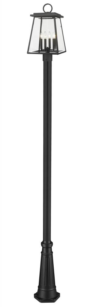 Tempting village nautical ambiance dabbles with updated historical charm in a fixture that brings sophistication to a walkway or landscaped space. From the Broughton collection, this four-light outdoor post-mounted fixture offers construction of sleek black aluminum and clear beveled glass panels on its lantern-style shade. Romantic candelabra bulb mounts and an ornate base seal the deal on a tasteful look.