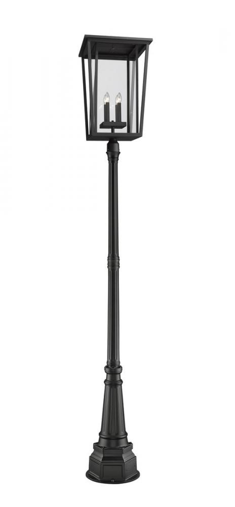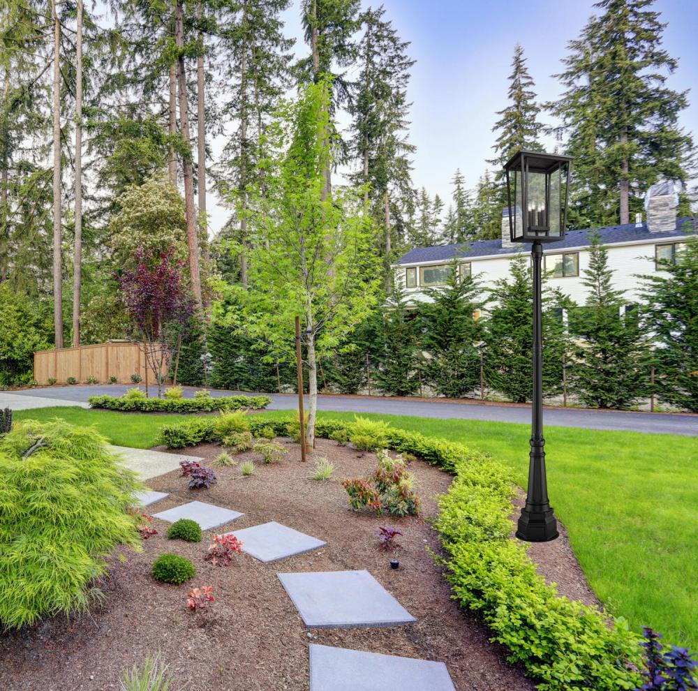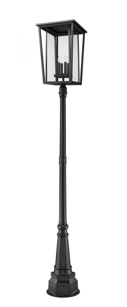 This four-light outdoor post-mounted fixture creates a cool mix of old and new. From the Seoul collection, this extraordinary light offers a geometric-inspired black finish aluminum fixture with geometric lines and specially cut clear glass. An elegant post creates the perfect venue to showcase this elegant light.