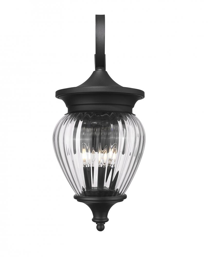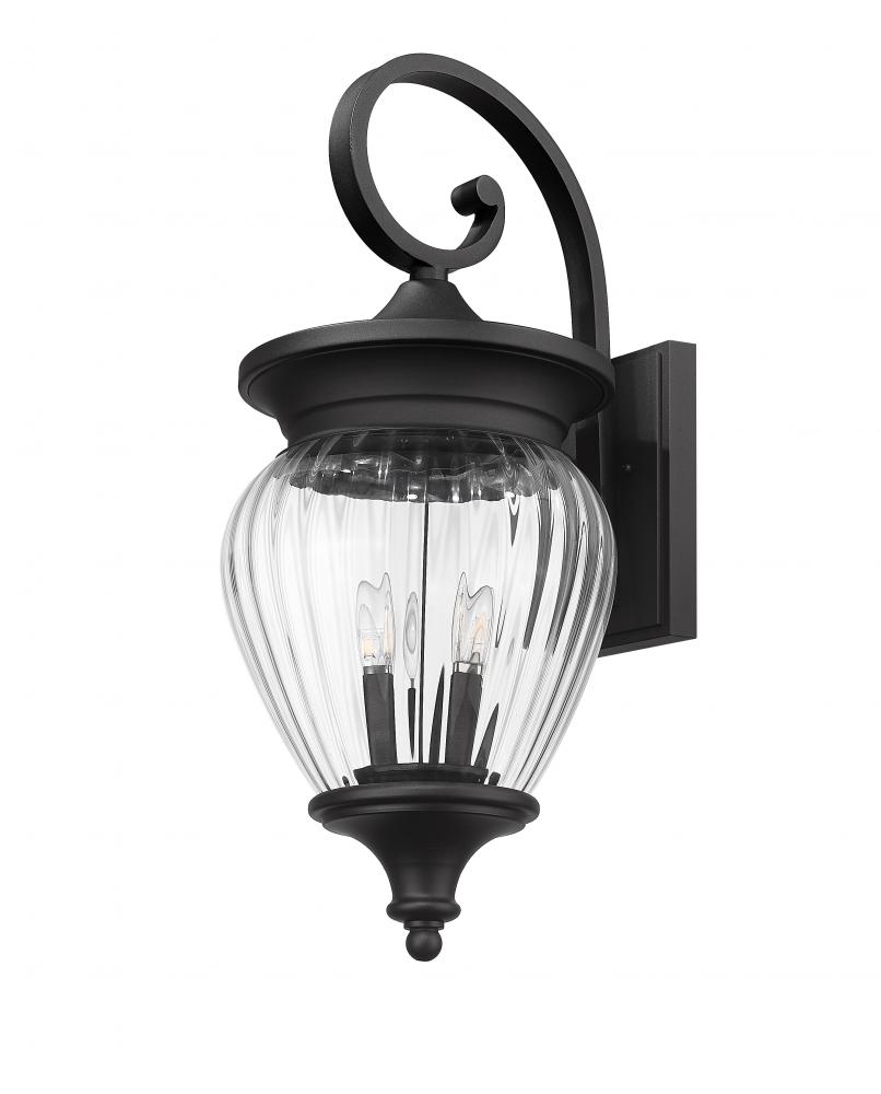 Chic artisan style delivers a decadent look in a four-light outdoor wall light designed for impact. A shapely clear ribbed glass shade nestles within Coastal black paint finish aluminum framing, decadent and inspired by a gallery influence. Ornate accents and dimming features make this a must-have fixture for structures or patios.