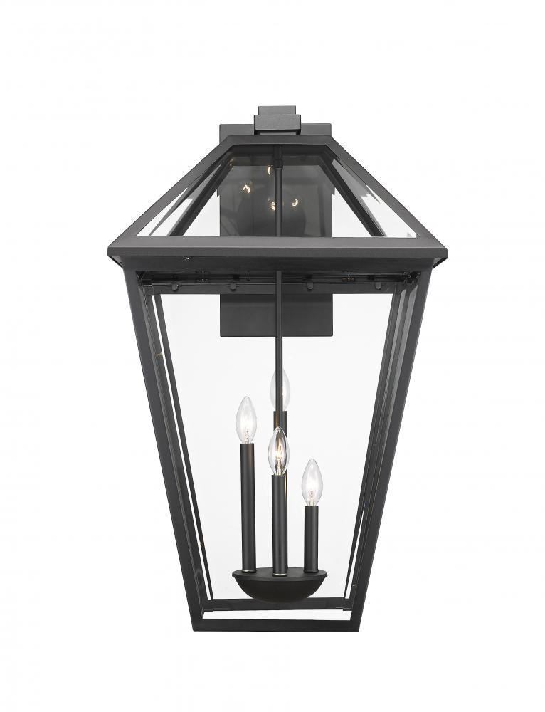Bring a transitional and industrial inspiration to exterior spaces with the dynamic design of the Talbot four-light outdoor wall sconce. Illuminating a porch or deck with this tasteful fixture, it offers a lantern-like silhouette with a hint of village charm. A black finish stainless steel nestles panels of clear glass, offering a full view of clustered slender bulb mounts, creating a symmetrical look that adds class.