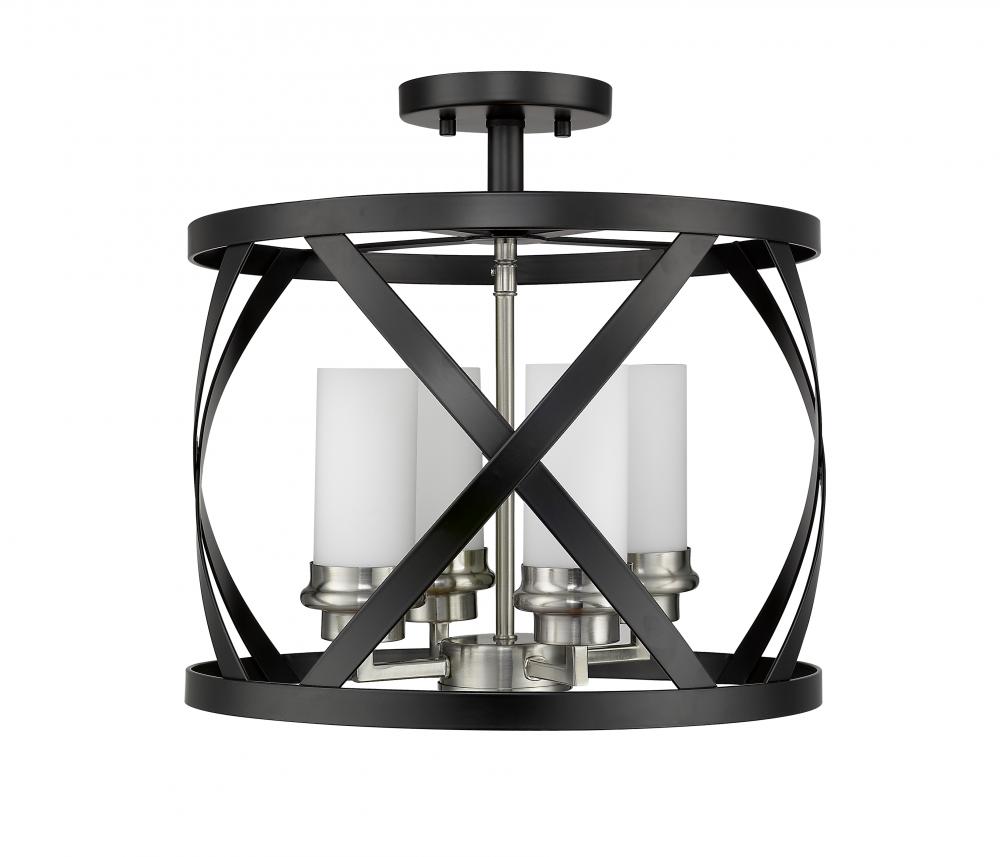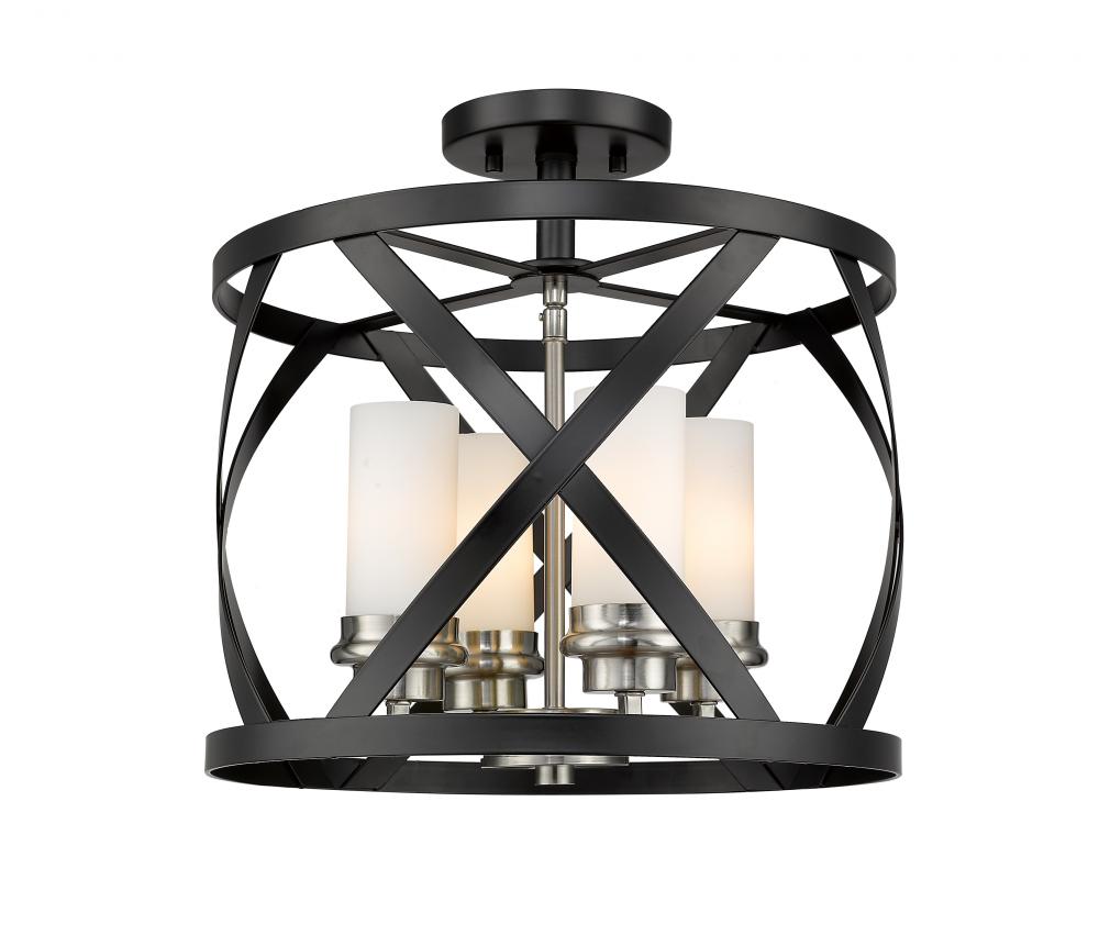 Enhance your home lighting with the stylish charm of this two-tone four-light semi-flush mount light. It features a matte black and brushed nickel finish in an alluring round design highlighted by an X-cross pattern. You will enjoy the immediate upgrade in ambiance this light brings to any hallway, bathroom, dining room, or game room.