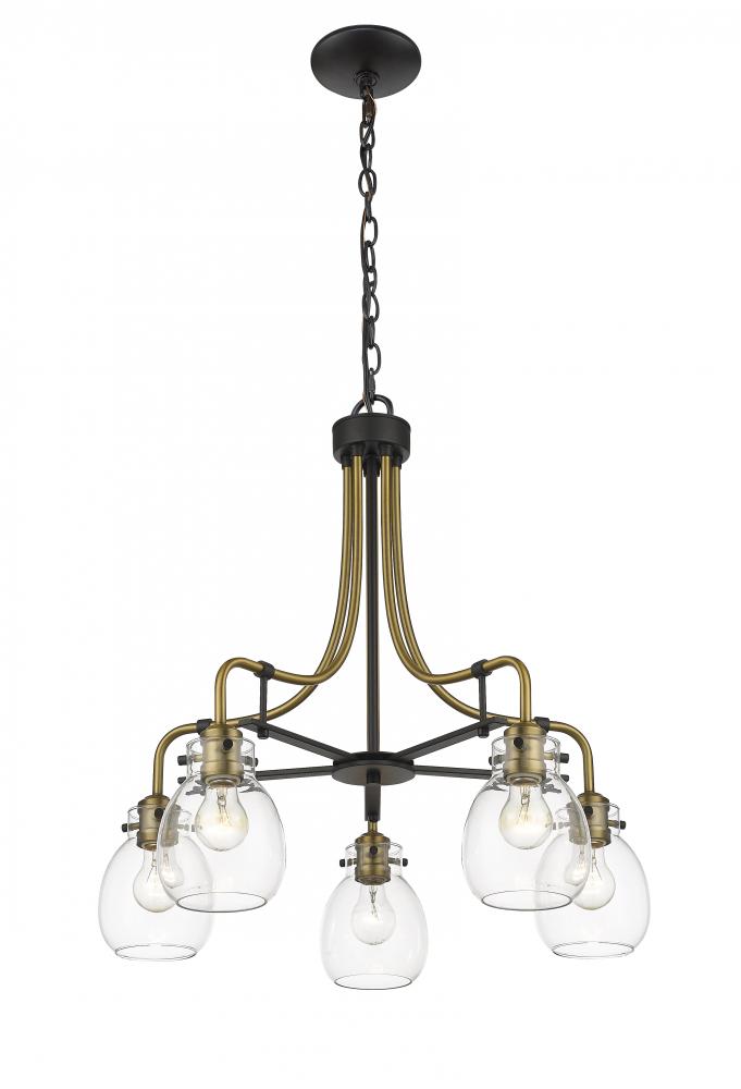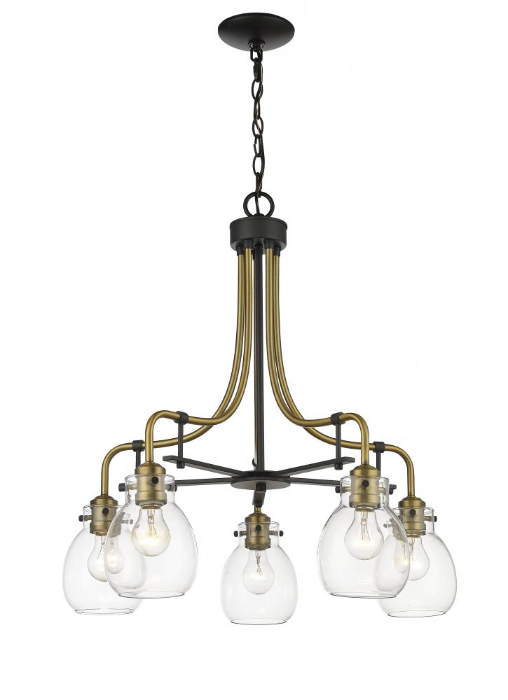 Add intrigue and captivating beauty to a transitional space with this elegant fixture. A circular silhouette with an olde brass and matte black finish frame shows off delicate clear glass shades, making this five-light chandelier an exceptional addition to a transitional dining or living space.