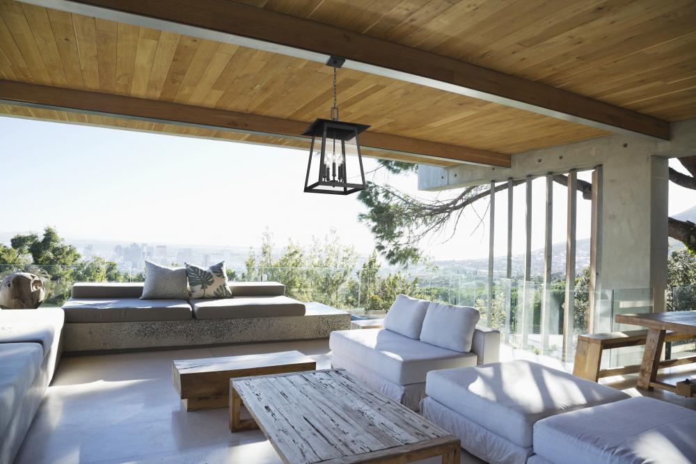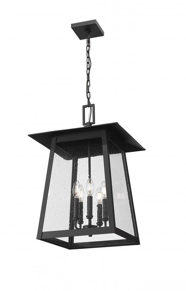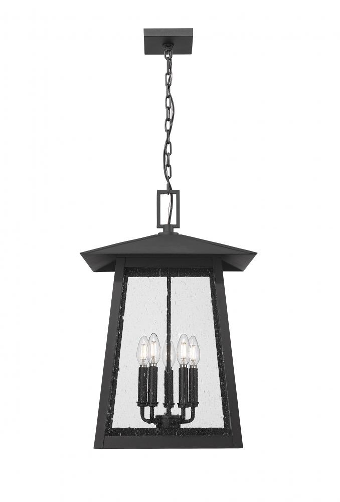 Take a traditional look and modernize it with sophistication as you place this five-light outdoor chain mount ceiling fixture in an exterior setting. Its lantern motif is timeless and character-rich, pairing clear seedy glass panels for texture with a chic Coastal black finish that stands the test of time. This fixture is also dimmable for optimal versatility.