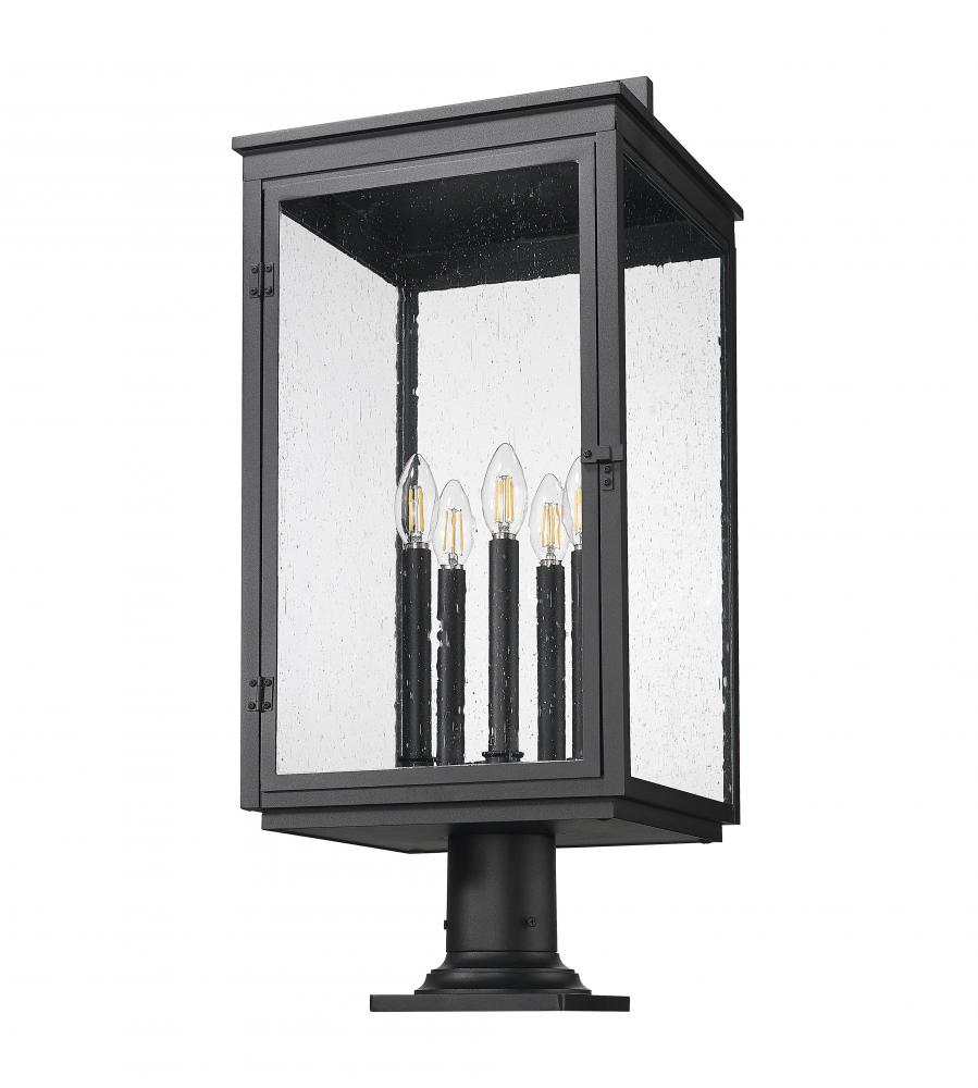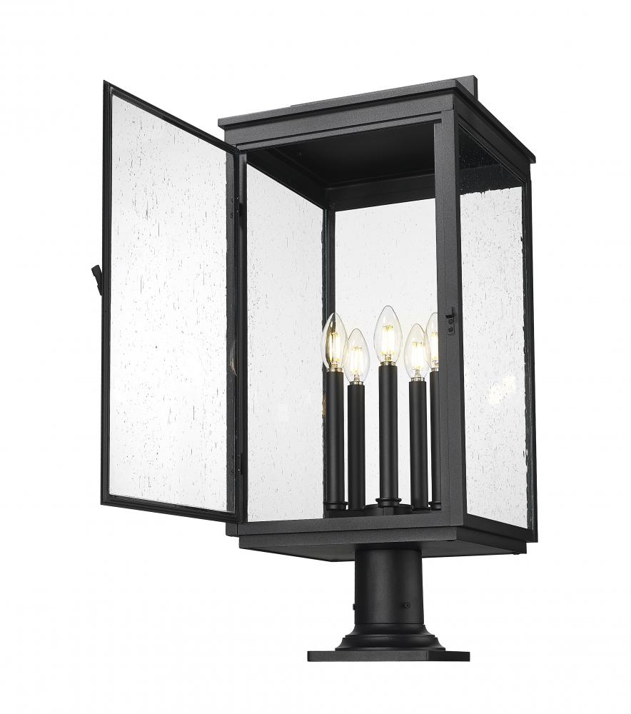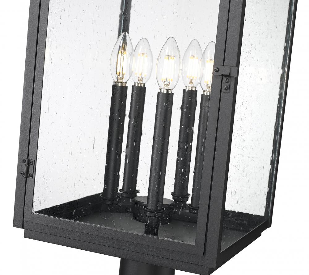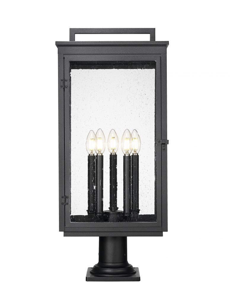 Five lights ensure superior brightness and ambiance from this traditional Mission outdoor pier mount light fixture. Charming on a deck, porch or patio, it features a craftsman-style handle and crown, with a textured sand black finish that offers timeless appeal. Five candle-style lights are tucked behind clear seedy glass, offering texture and depth with a sense of inviting curb appeal.