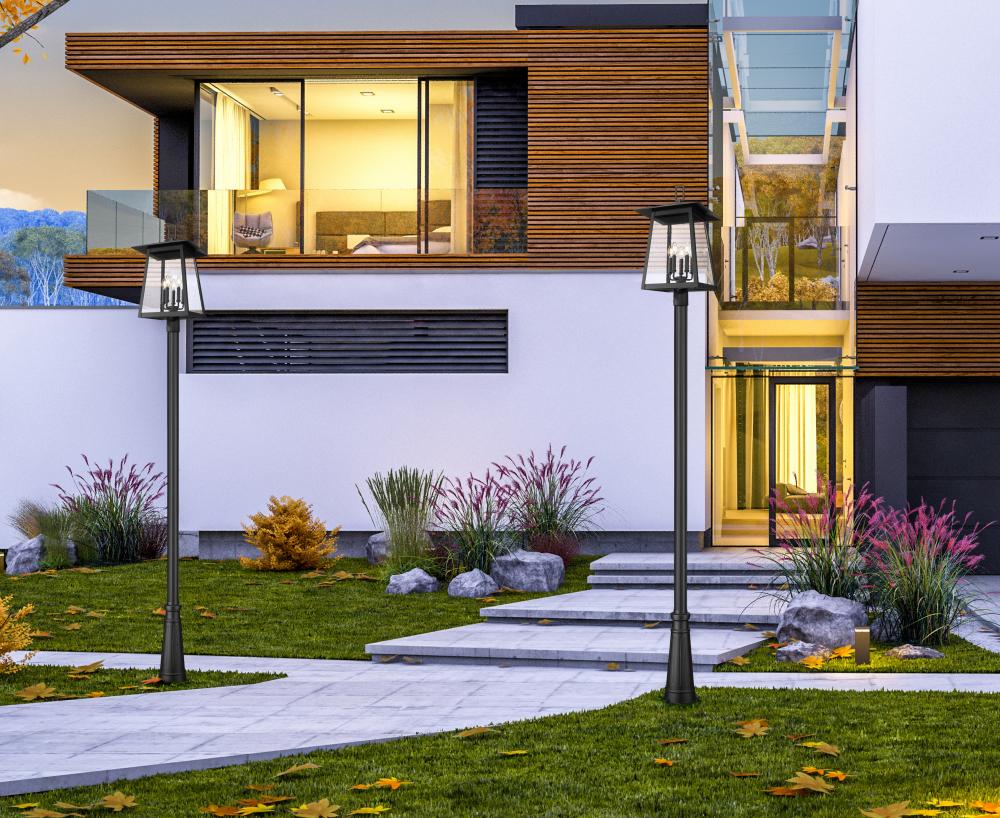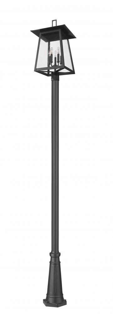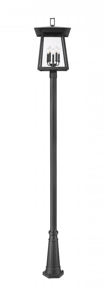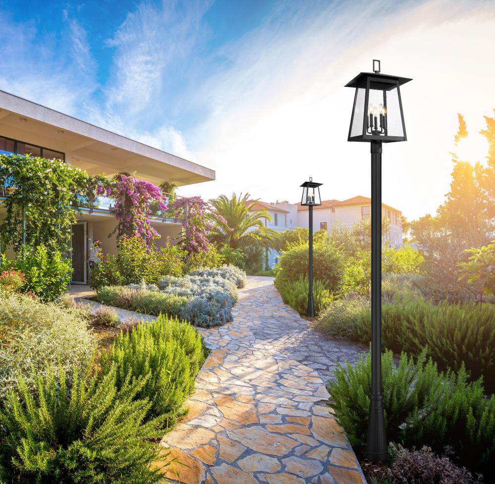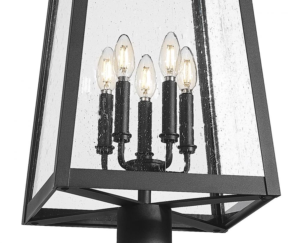 Soft lighting illuminates an exterior space with elegance as this five-light outdoor post-mounted fixture enhances a front or back yard. With a gently contoured pole and lantern silhouette, it offers a Coastal black finish aluminum thats smooth and appealing. The light is enhanced with a candelabra cluster and clear seedy glass that brings the perfect hint of vintage romantic ambiance.
