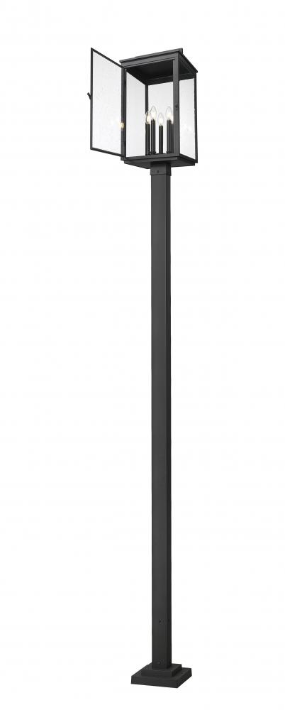 Set the tone with the simple post and charming handled crown featured on this traditional Mission five-light outdoor post mount fixture. Its clean-lined form is crafted in aluminum and received a marine-grade sand black finish for added texture and dimensionality. Clear seedy glass panes enclose the light cluster, adding a perfect hint of dimension and character.