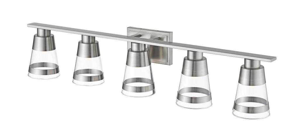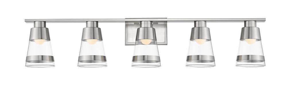 Set up a compelling focal point in a master bath suite with this five-light vanity fixture. Cool brushed nickel steel blends beautifully with clear glass conical shades, bringing a charming nautical look.