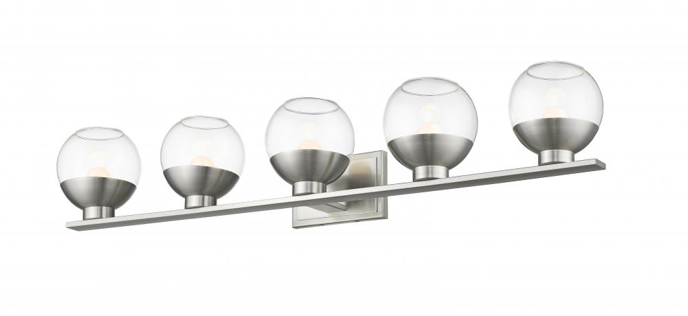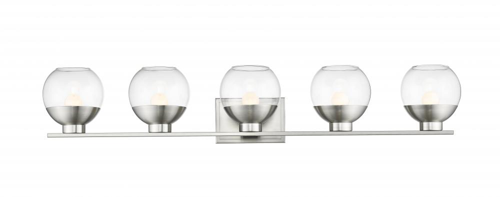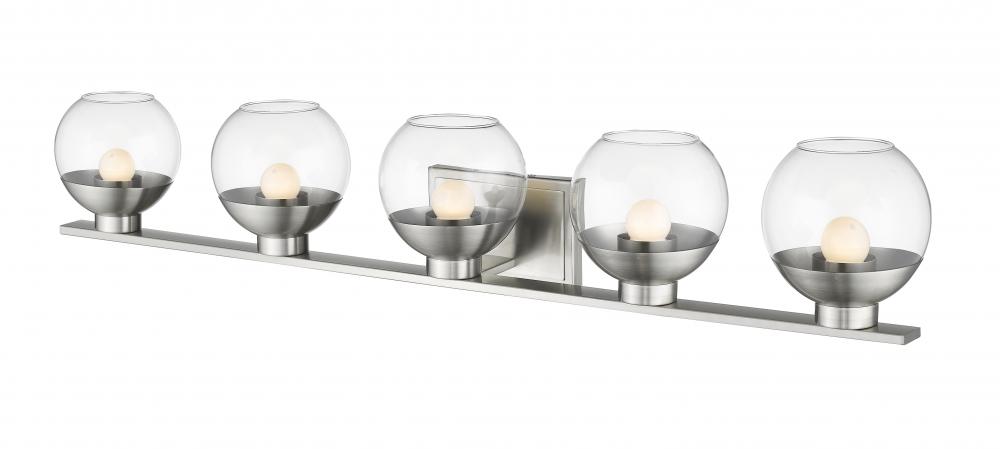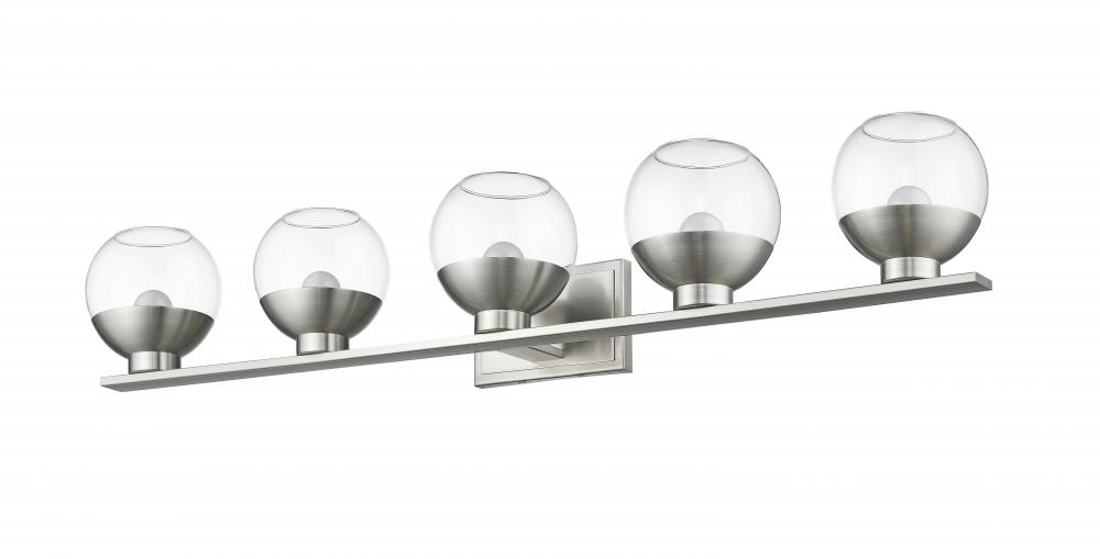 Make this five-light vanity fixture a marquee element of a custom master bath design. Romantic and artistic, its orb-shaped delicate glass shades blend with sleek brushed nickel finish steel to offer a compelling look as well as energy-saving integrated LED technology.
