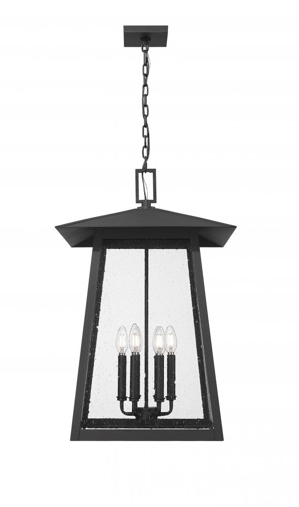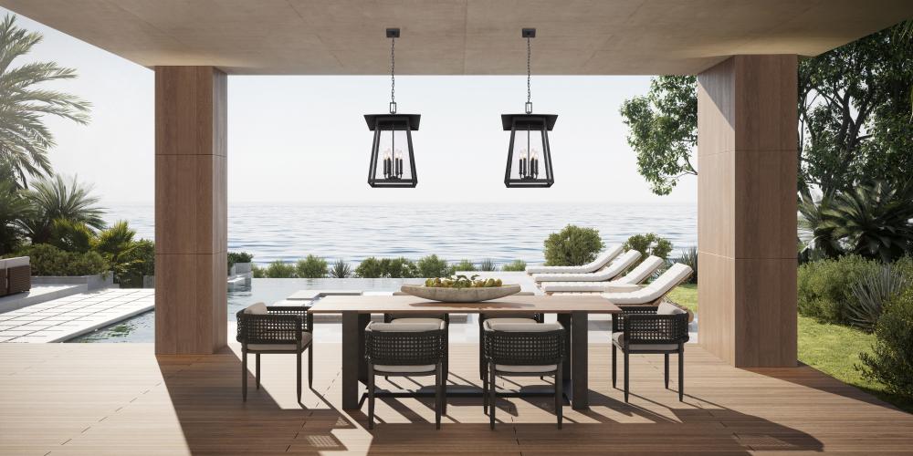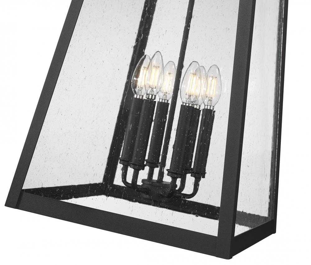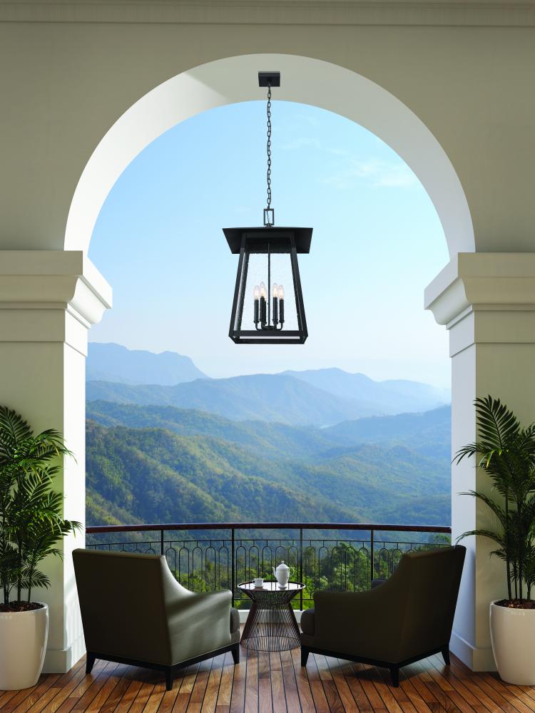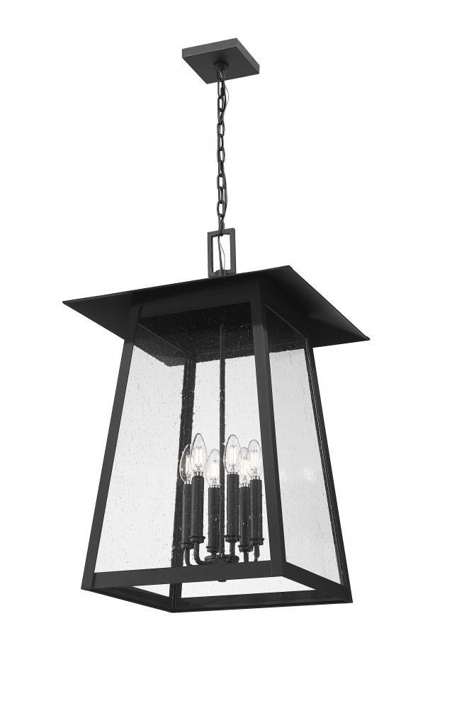 Update a timeless traditional look with this six-light outdoor chain mount ceiling fixture. Its birdcage-inspired design assumes the lantern motif, with seeded glass panels and Coastal black painted aluminum giving way to romantic candelabra bulb mounts inside. This dimmable fixture is an ideal solution for outdoor lighting challenges.