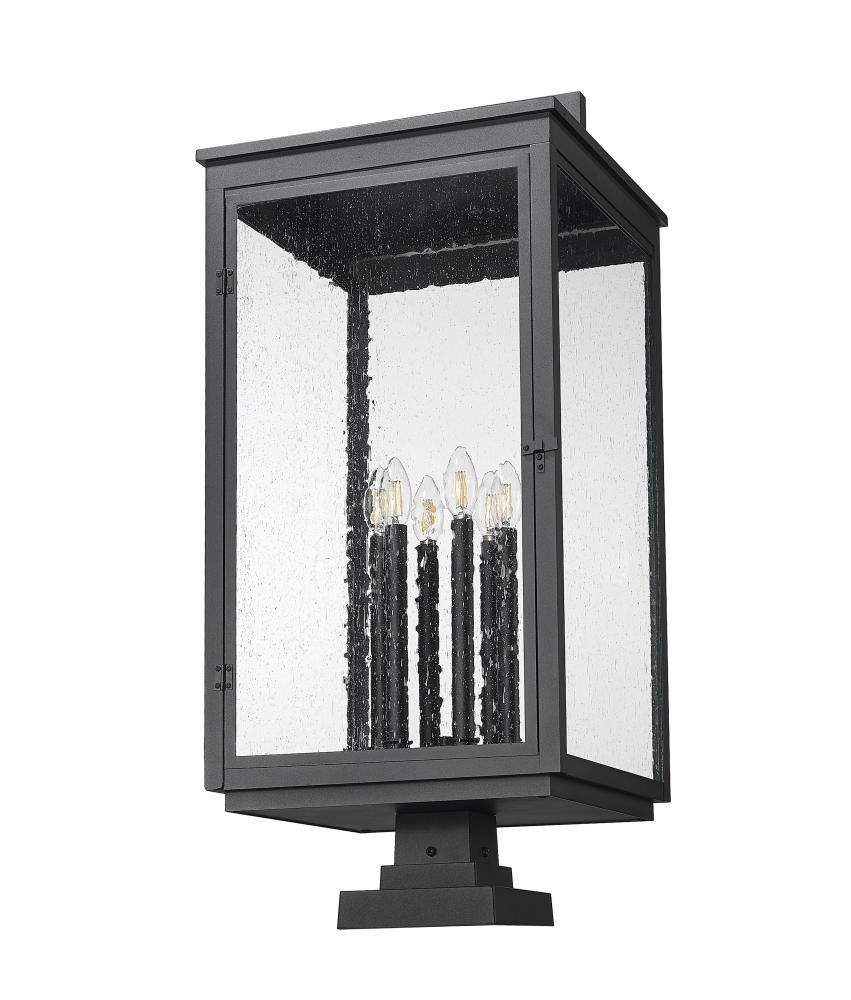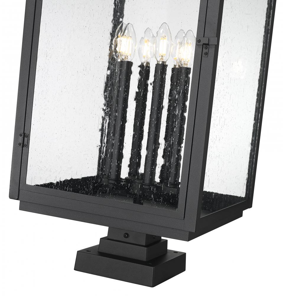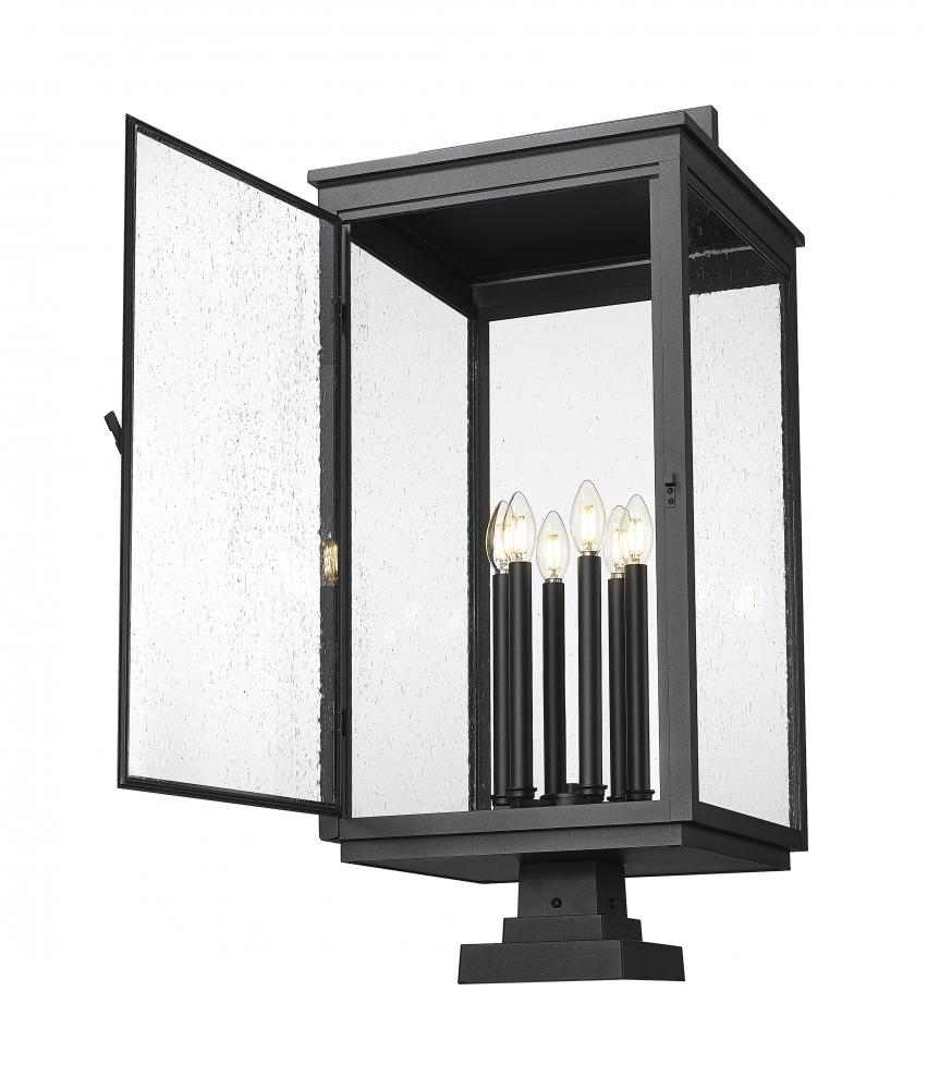 A decorative handle adds the perfect dose of craftsman charm to this traditional Mission six-light outdoor pier mount fixture. Clear seedy glass panes allow full view of the candelabra cluster of lights tucked within, offering plenty of depth and dimensionality. Its aluminum frame receives a marine-grade sand black finish with subtle texture, perfect for curb appeal that stands the test of time.