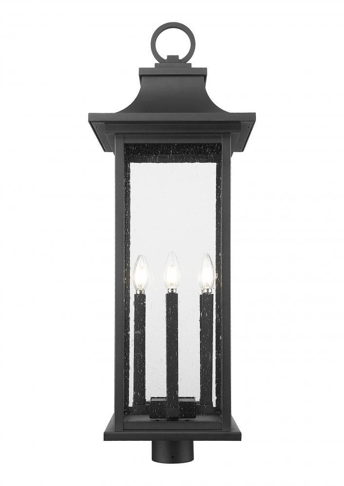 Set the tone on your patio or porch with this transitional six-light outdoor post mount light. It pairs aluminum construction with a durable coastal black finish, creating a fixture that stands the test of time. Six candelabra lights are clustered within the lantern, with clear seedy glass for protection and dimensionality.