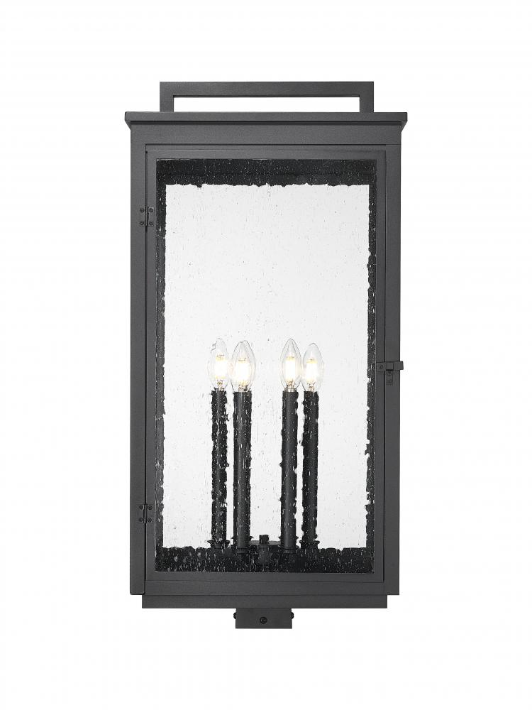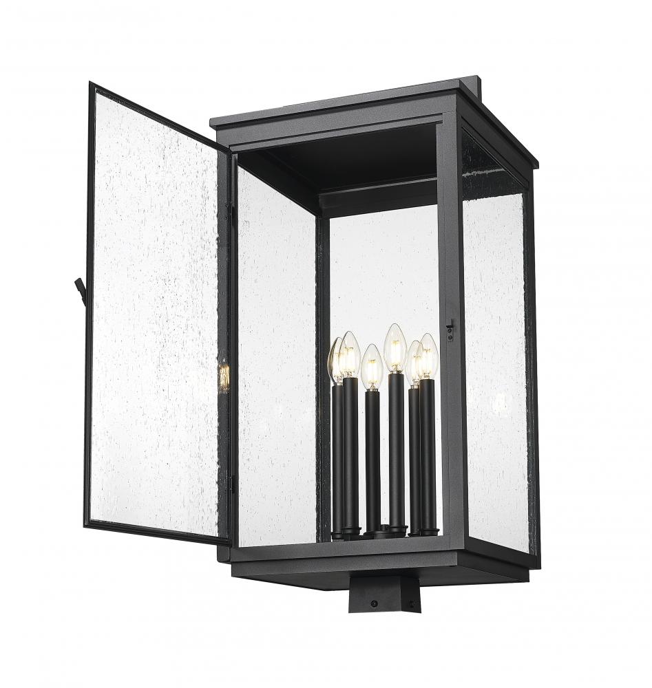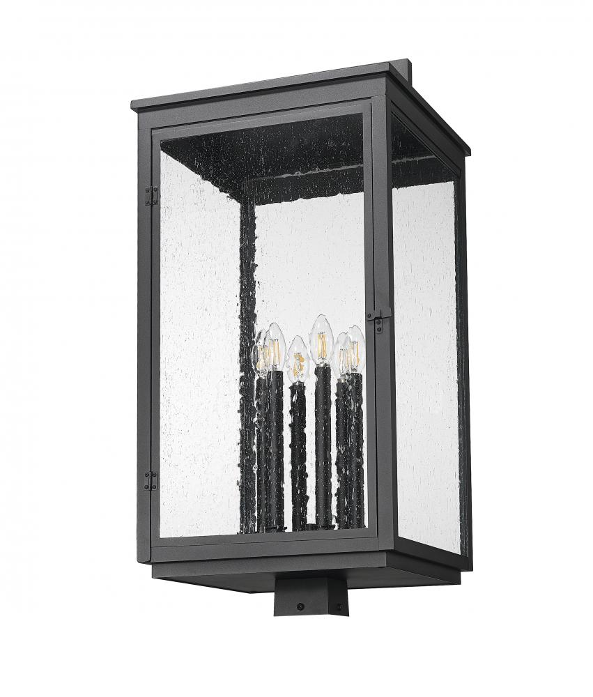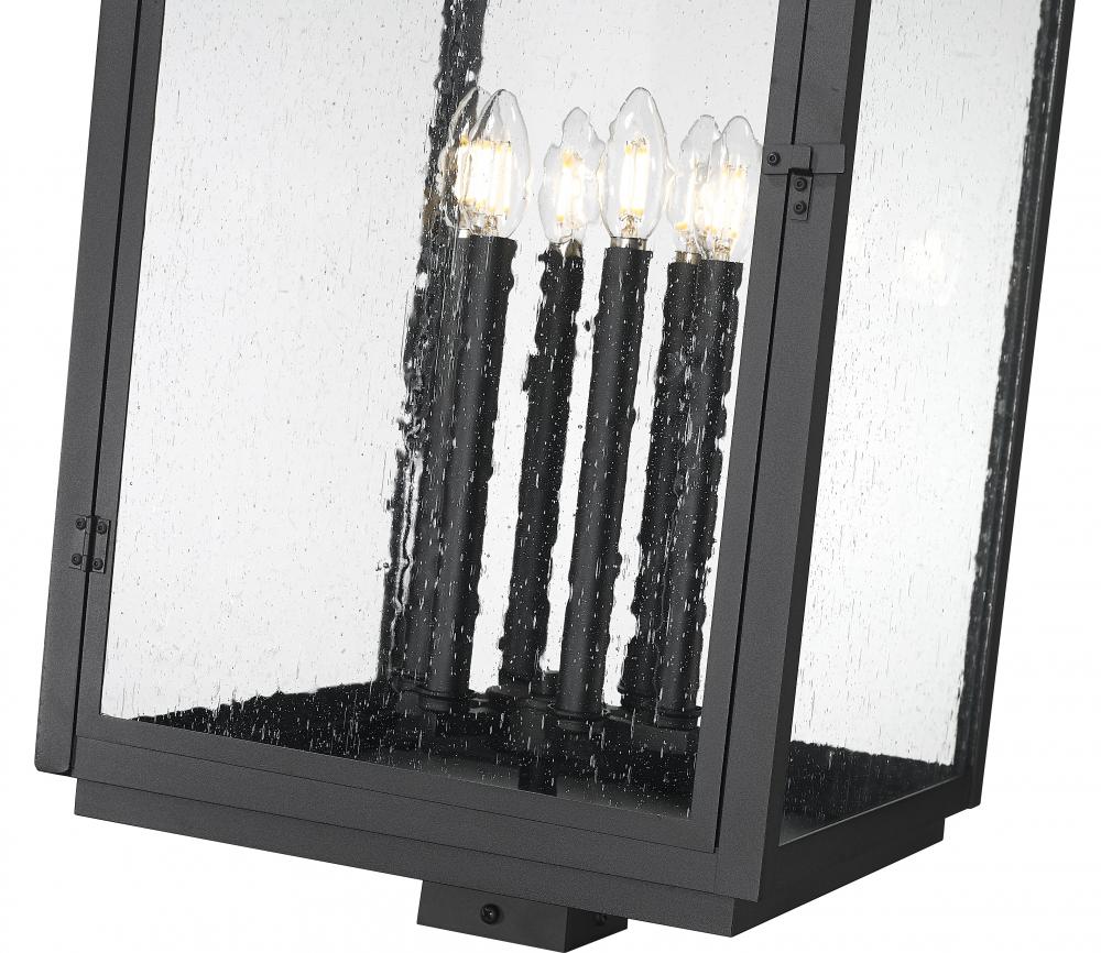 This six light post mount fixture creates a bold impression with its sculptural lines and sand black finish. Clear seedy glass surrounds the candle-style lights, diffusing a warm, layered glow with vintage charm. It brings a sense of drama and refinement to walkways, gates, or garden edges.