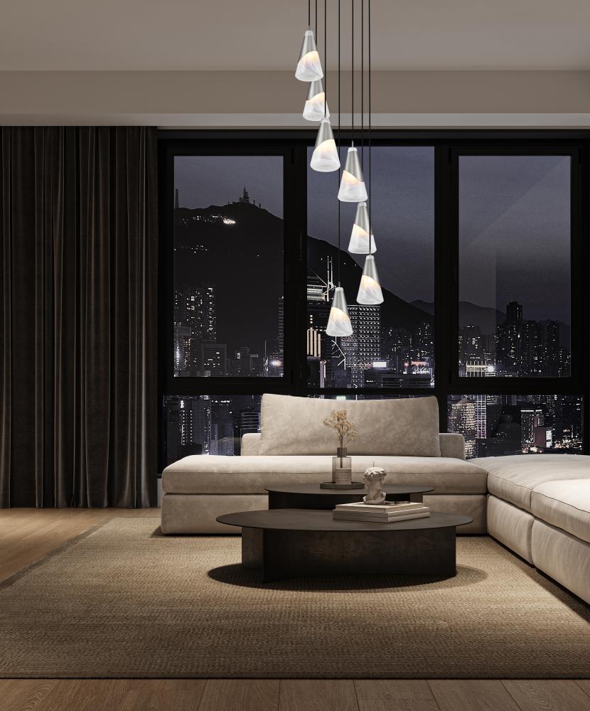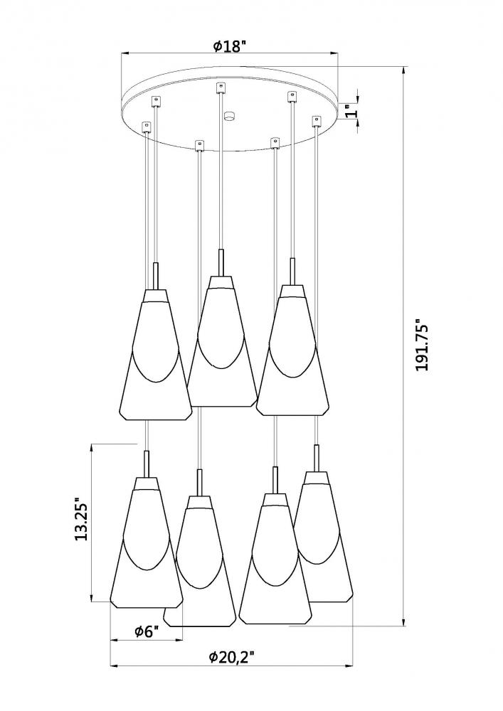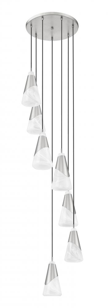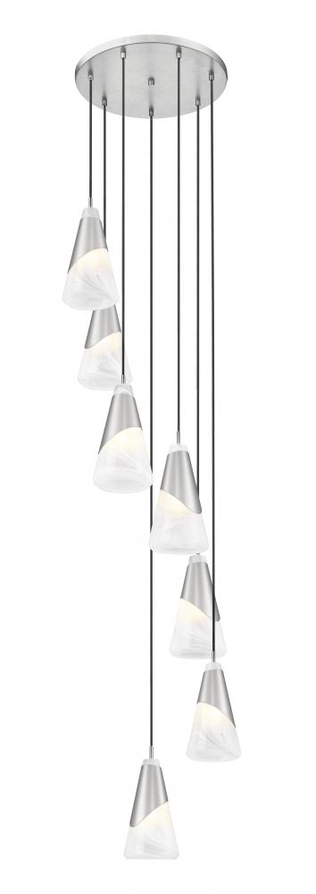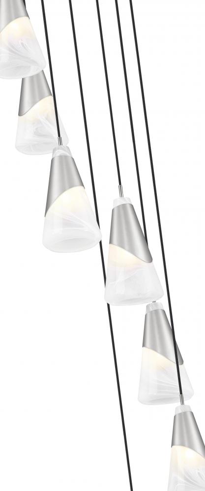 A spiraling fall of lights pairs with swirling artisan glass on this eye-catching modern seven-light chandelier. A superb addition to your foyer, living or dining room, it radiates sophistication with a sleek brushed nickel finish and opulent details, including metal shrouds that collar conical glass for diffused, inviting illumination in your home.