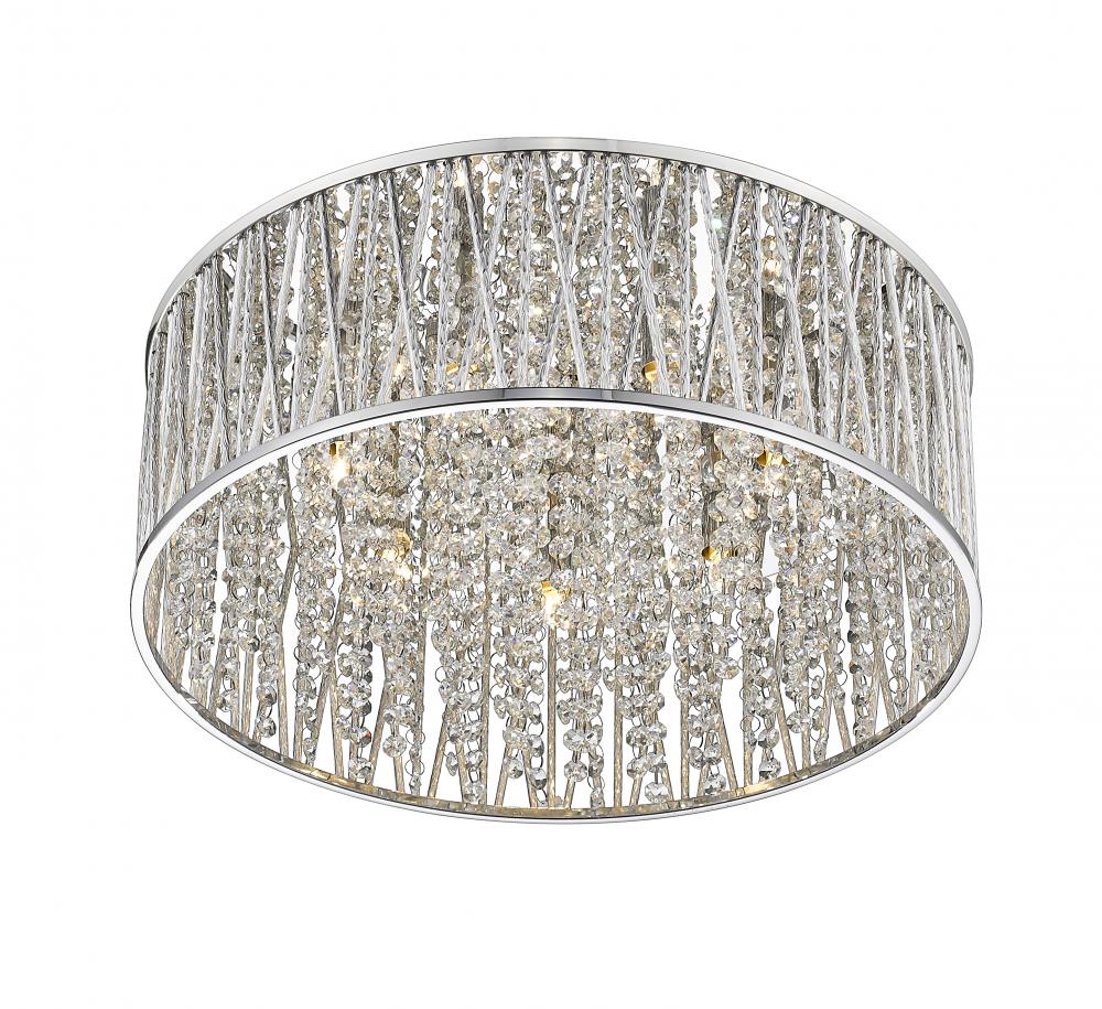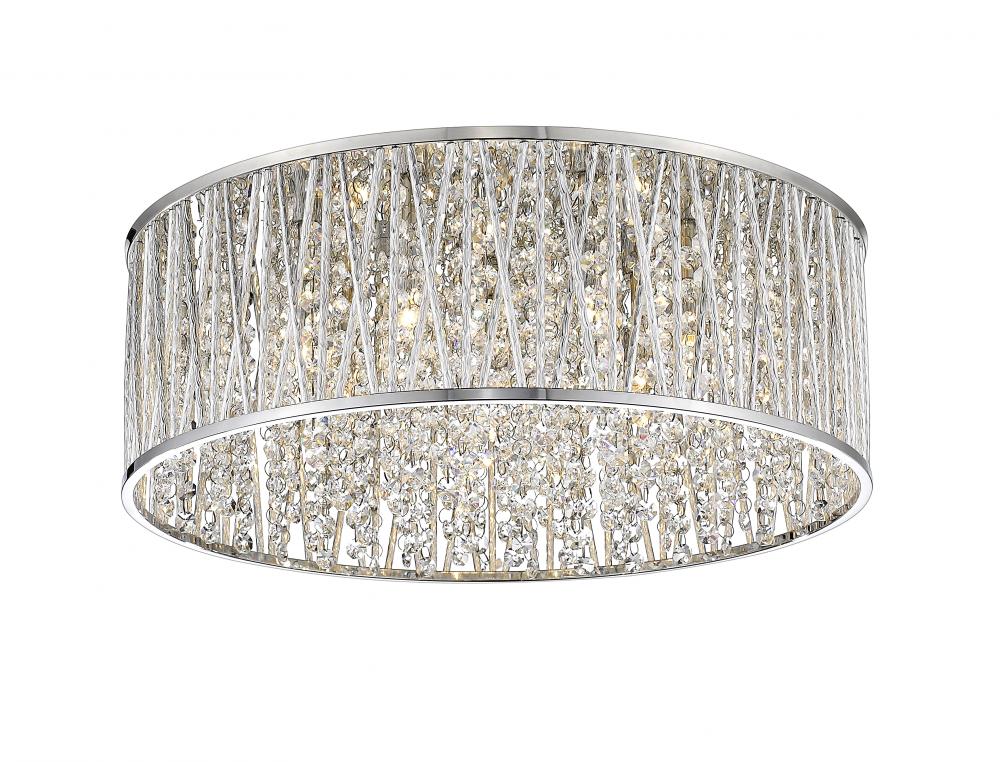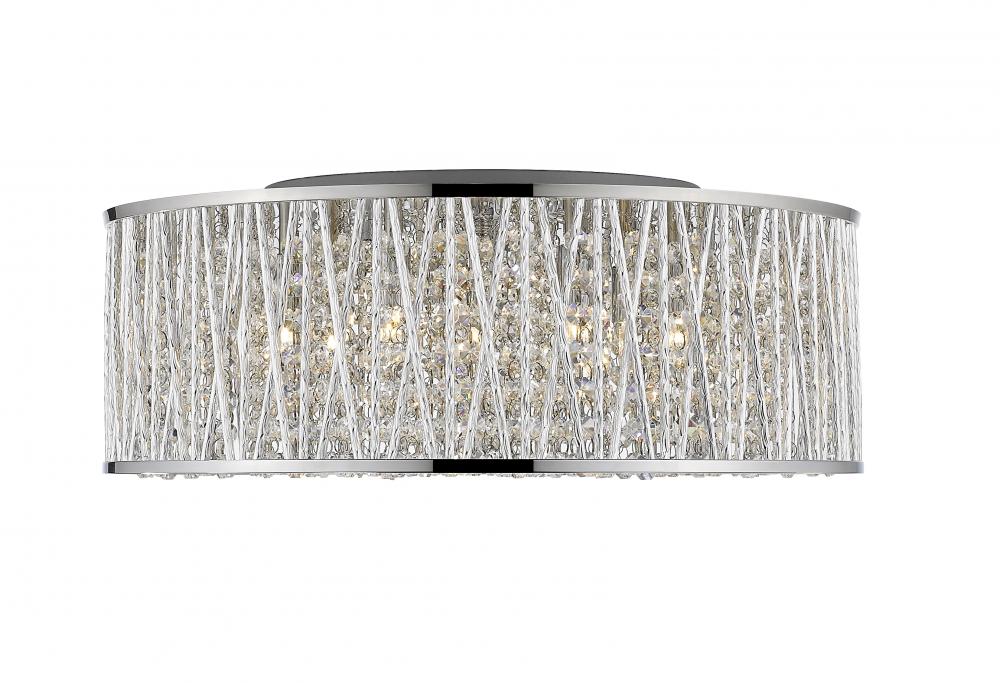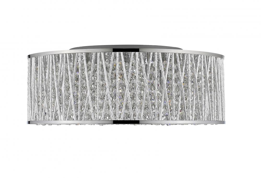 A chic gleam complements lean lines of this chrome finished aluminum strikingly contemporary seven-light flush mount lighting fixture. Gleaming and glowing lines of polished crystals intertwined with the unusual crossed and single line chrome shade pattern shines in an elegantly modern style.