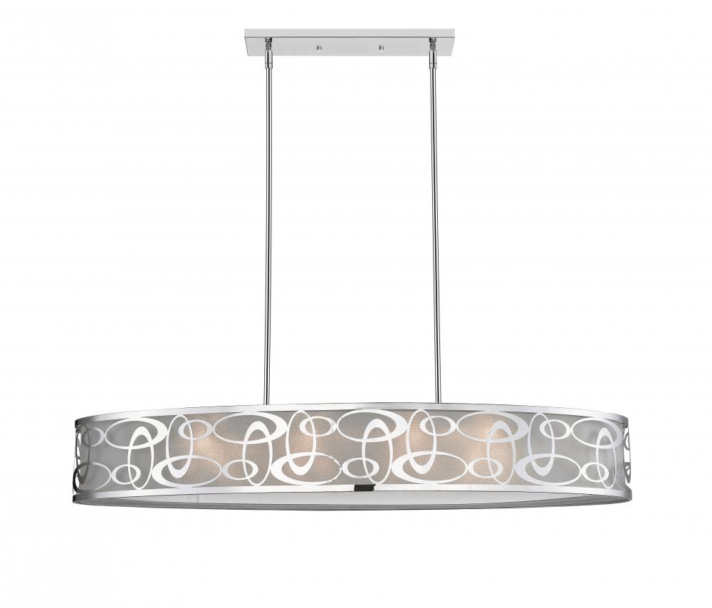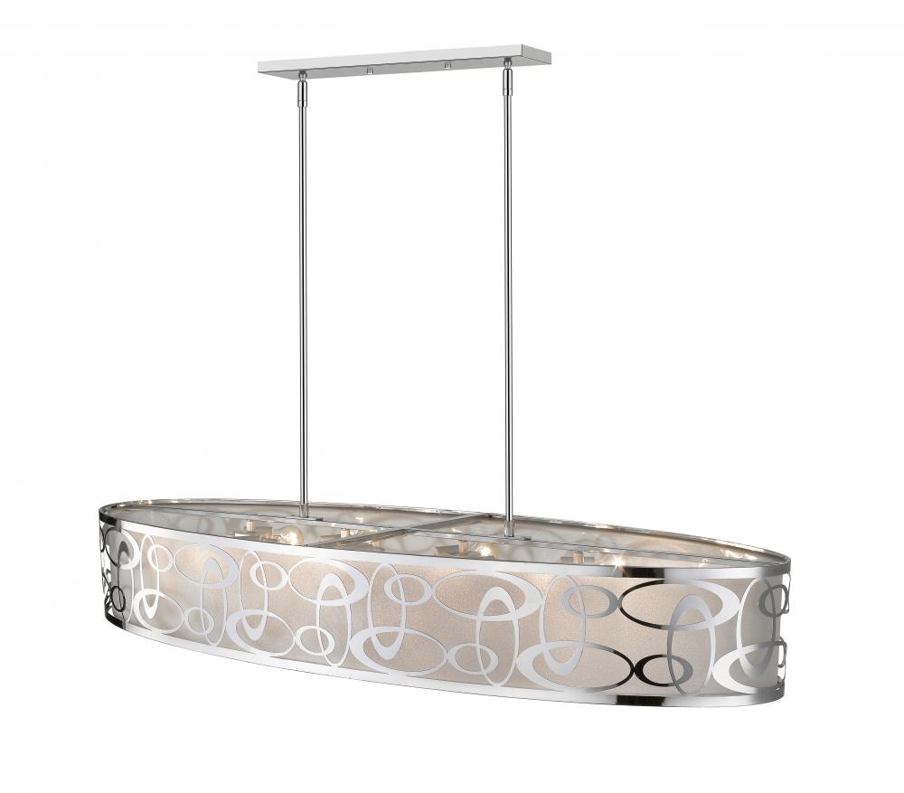 This stylish eight-light pendant offers a commanding presence and a light, artistic ambiance for illuminating island and bar spaces. Its white organza shade is nestled in a narrow oval frame made from chrome finish steel and showcasing floating elliptical shapes that add a lovely touch.