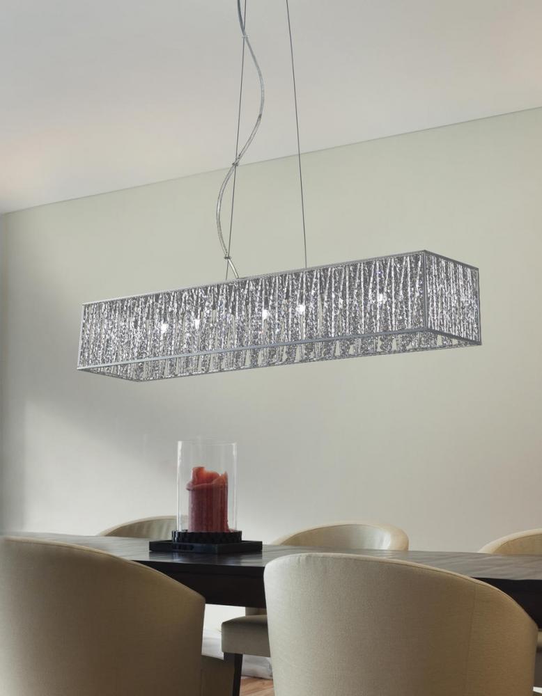 Sparkling crystals shine beautifully on this exquisite nine light fixture, and are paired perfectly with chrome hardware. Adjustable cable is included to ensure the perfect hanging height.